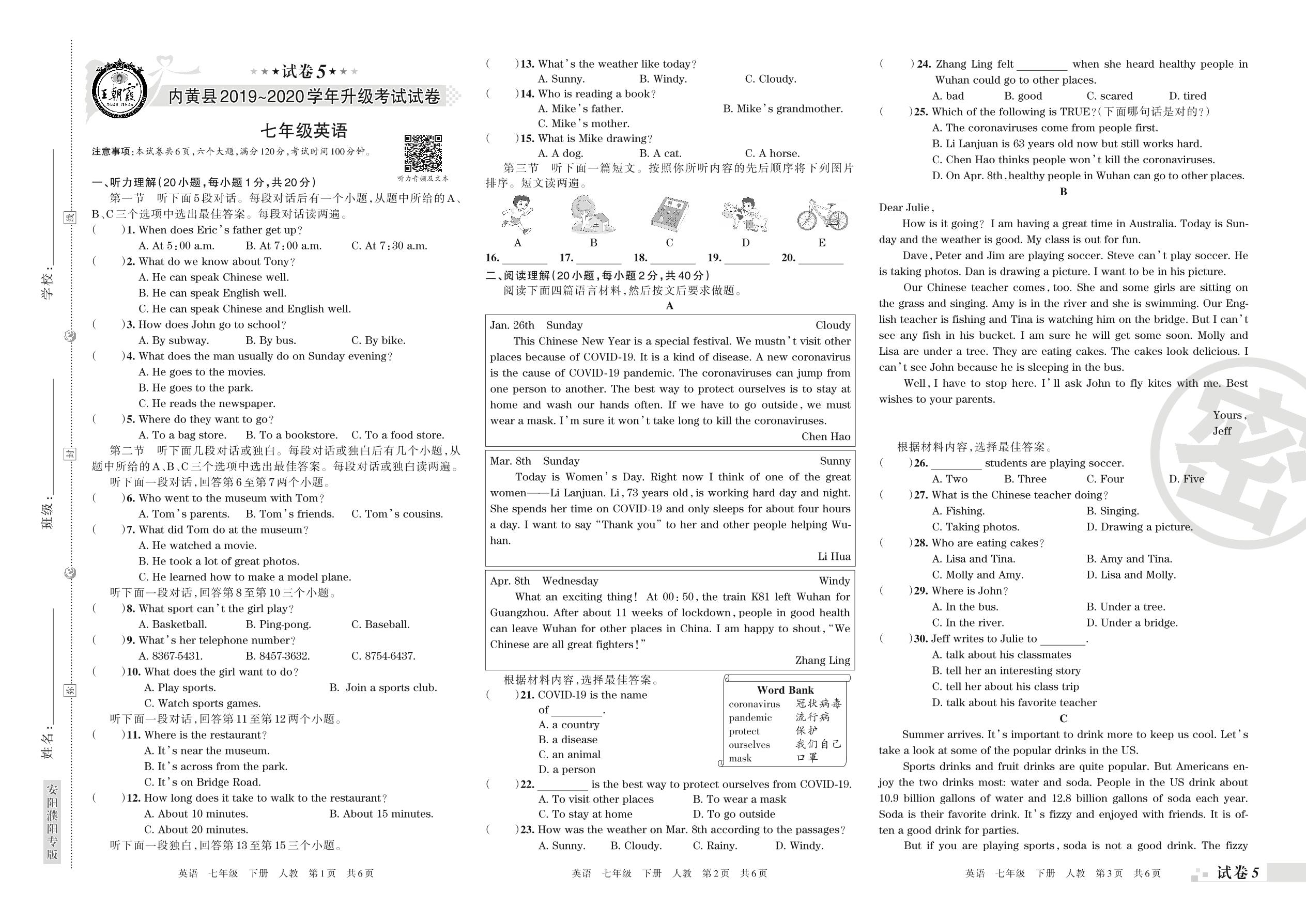 2019-2020学年第二学期安阳市内黄县七年级英语试卷(人教版)【5】