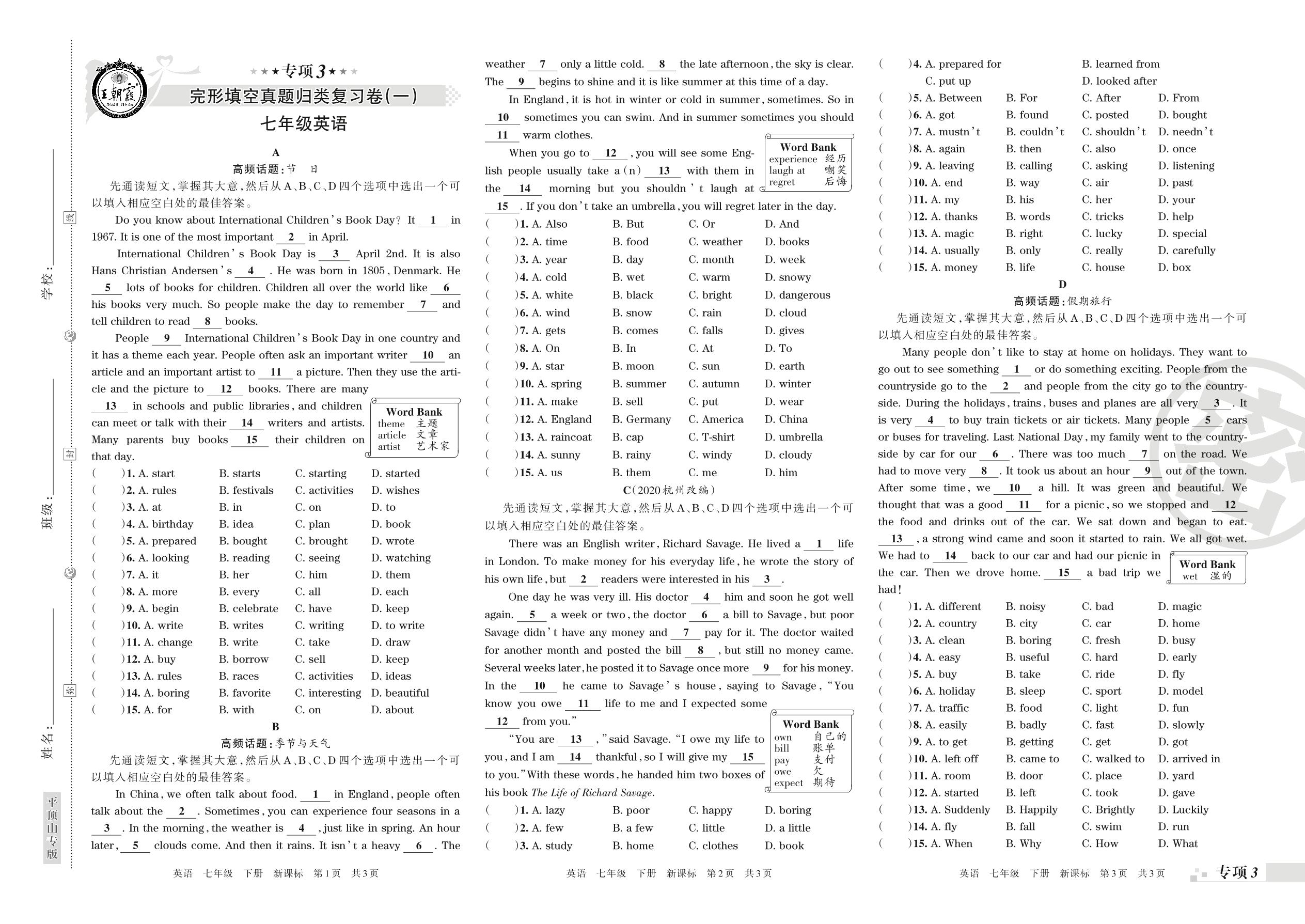 王朝霞期末专项卷——完形填空(一)、(二)真题归类复习七年级下册英语(新课版)【0】