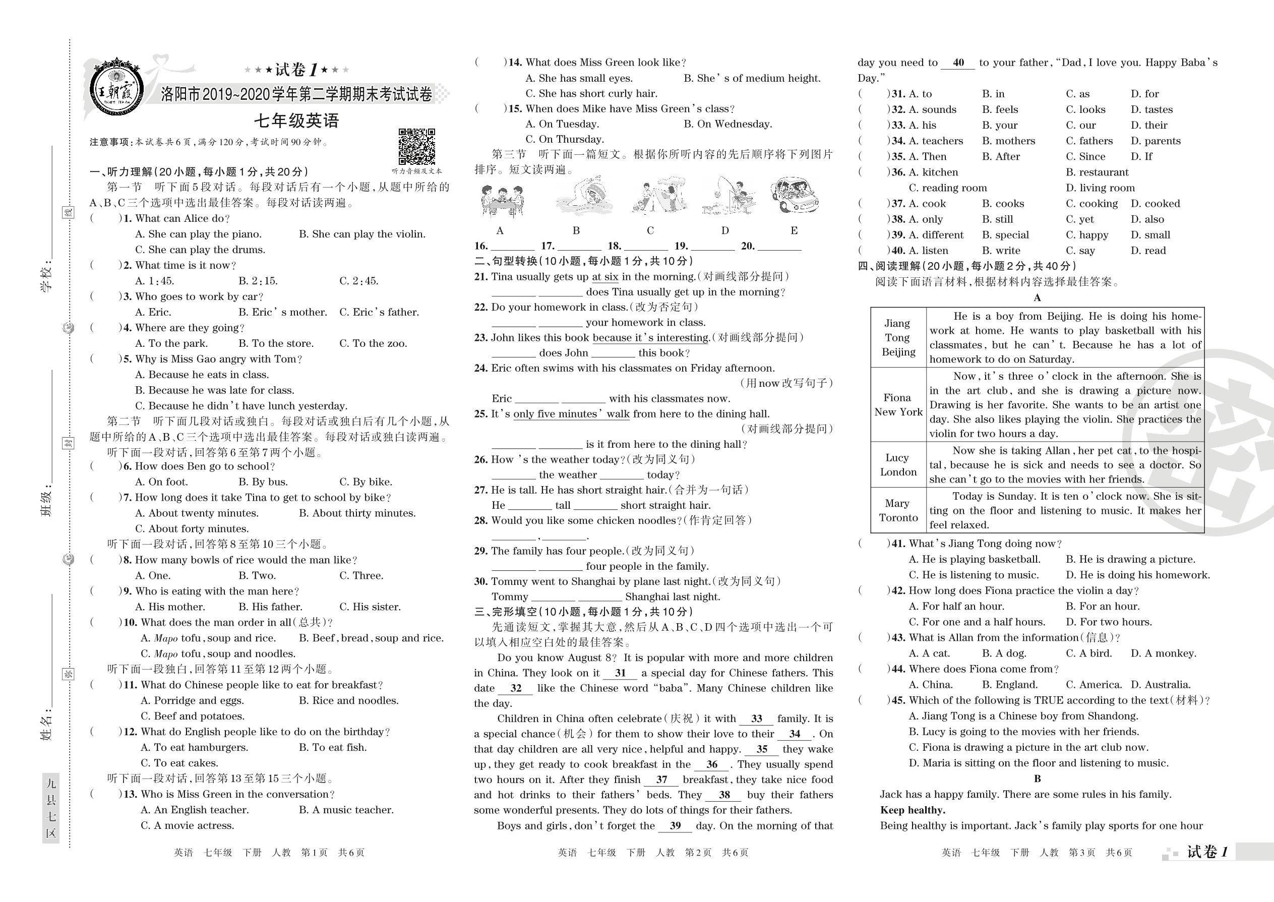 2019-2020学年第二学期洛阳市七年级英语试卷(人教版)【1】