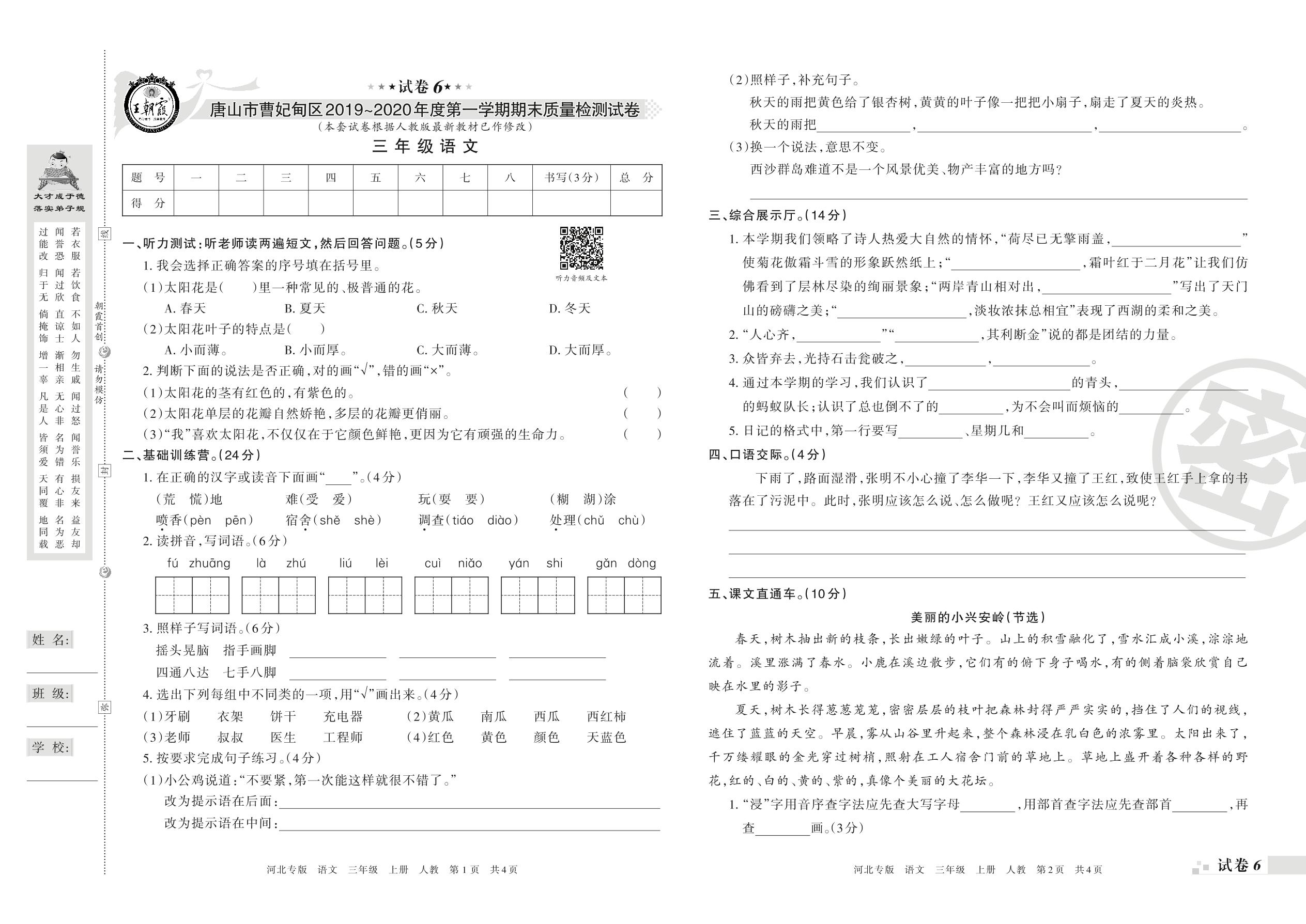 2019-2020学年第一学期唐山市曹妃甸区三年级语文试卷(人教版)【6】