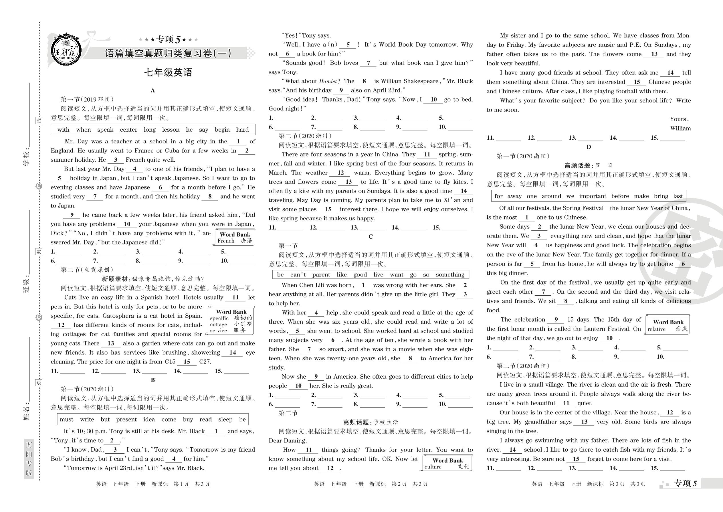 王朝霞期末专项卷——语篇填空一、语篇填空二真题归类复习七年级下册英语(新课版)【0】
