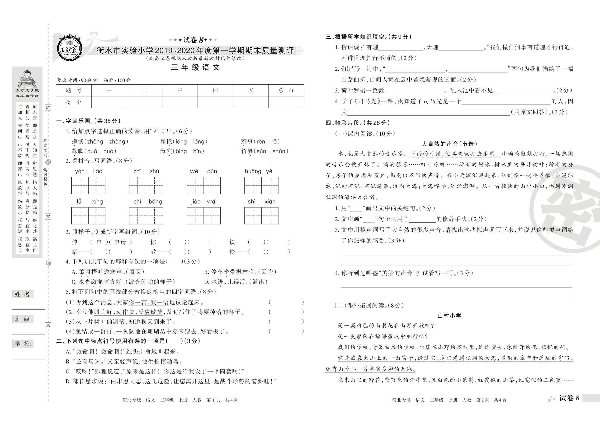 2019-2020学年第一学期衡水市实验小学三年级语文试卷(人教版)【8】
