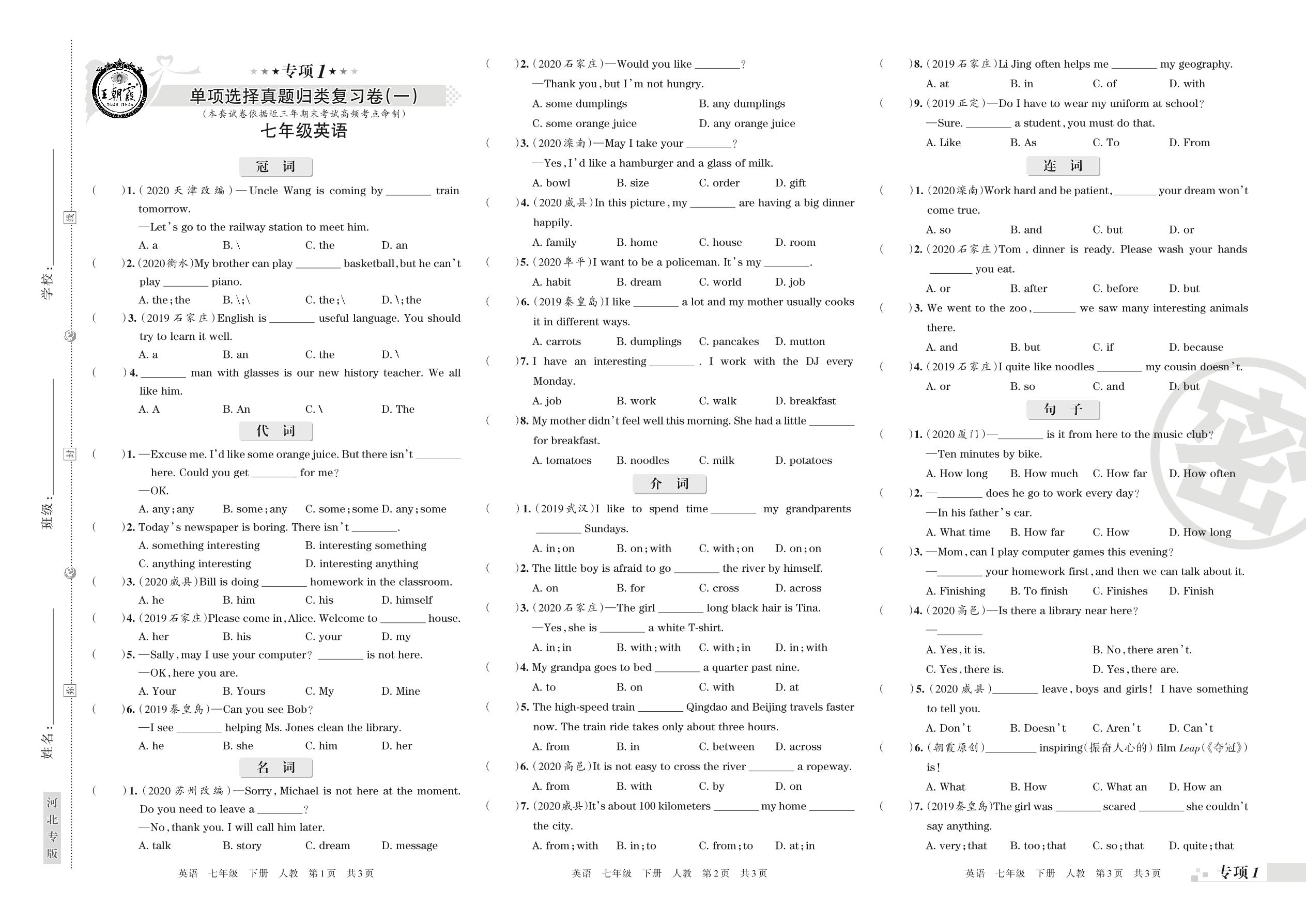 王朝霞期末专项卷——单项选择(一)、(二)真题归类复习七年级下册英语(人教版)【0】