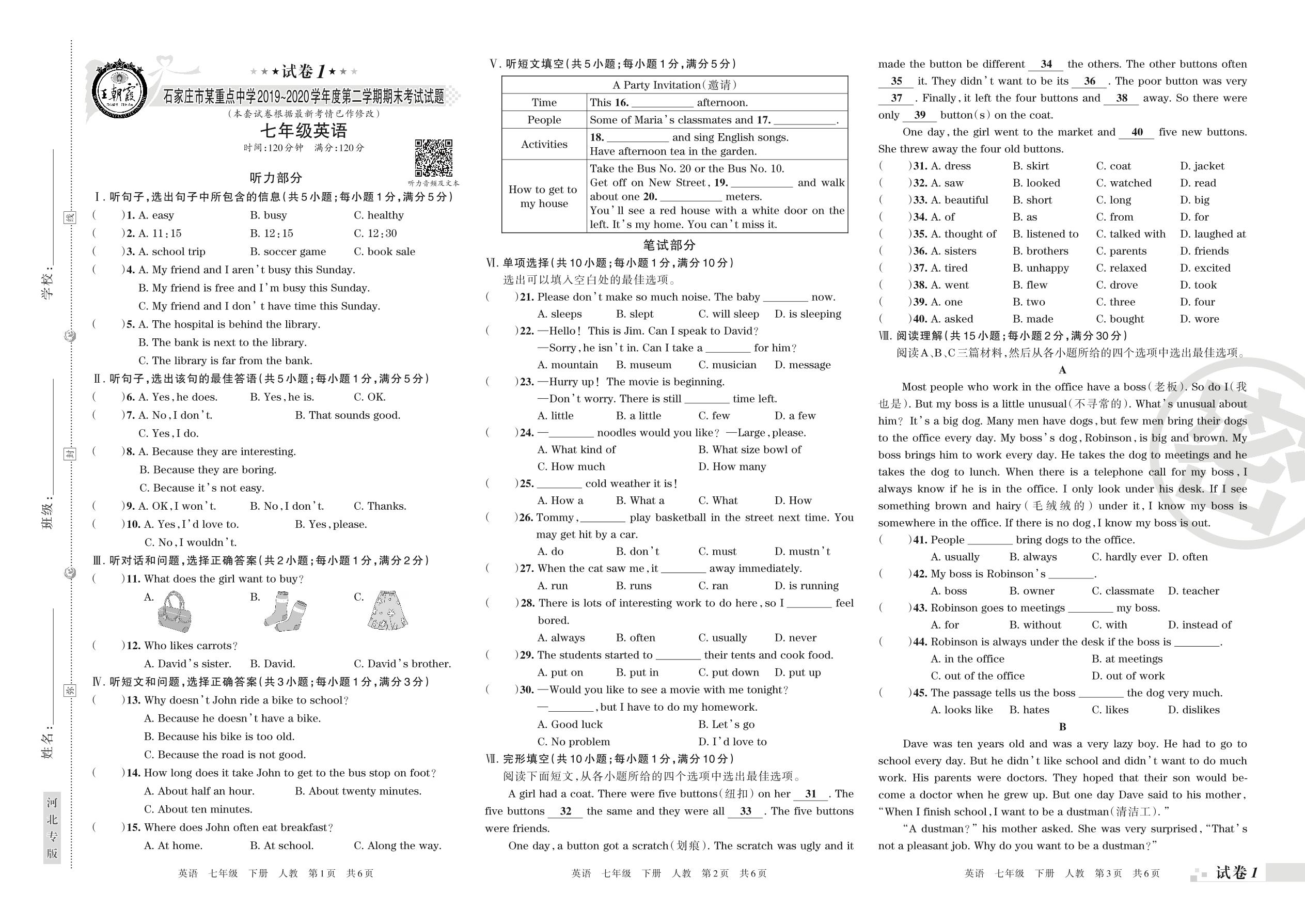2019-2020学年第二学期石家庄市七年级英语试卷(人教版)【1】