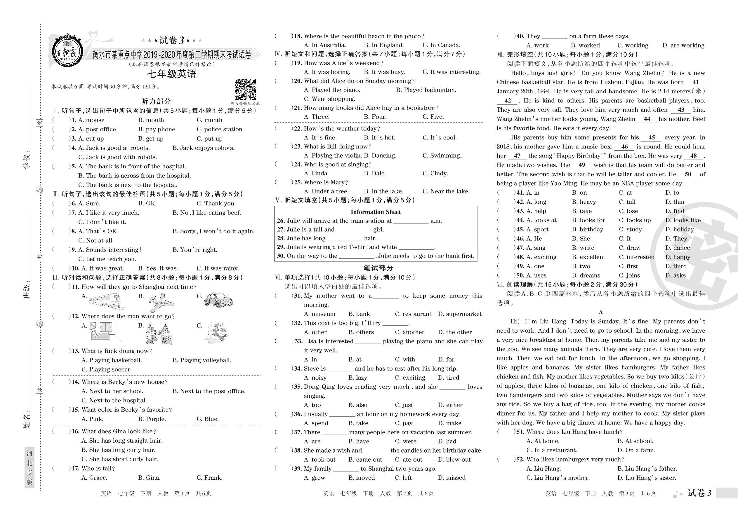 2019-2020学年第二学期衡水市七年级英语试卷(人教版)【3】