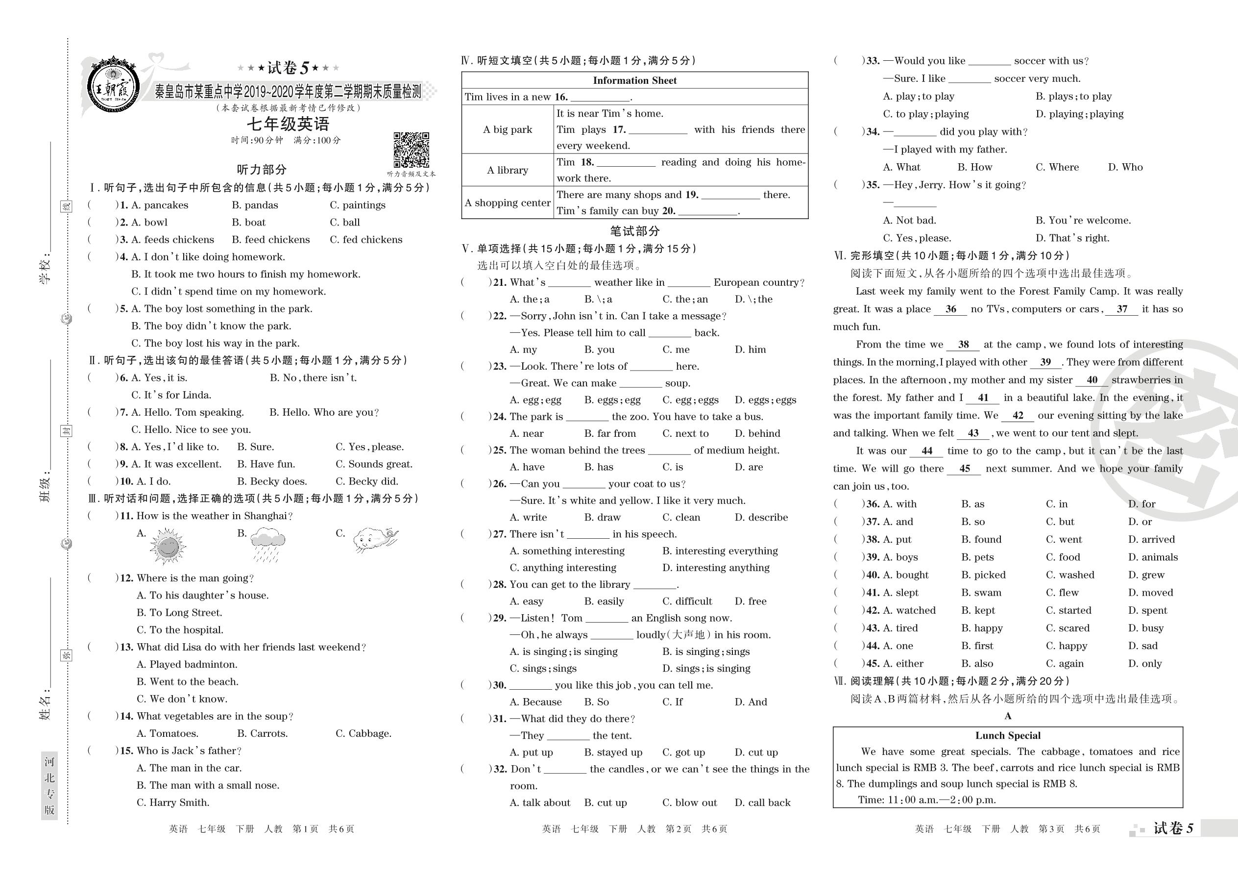 2019-2020学年第二学期秦皇岛市七年级英语试卷(人教版)【5】