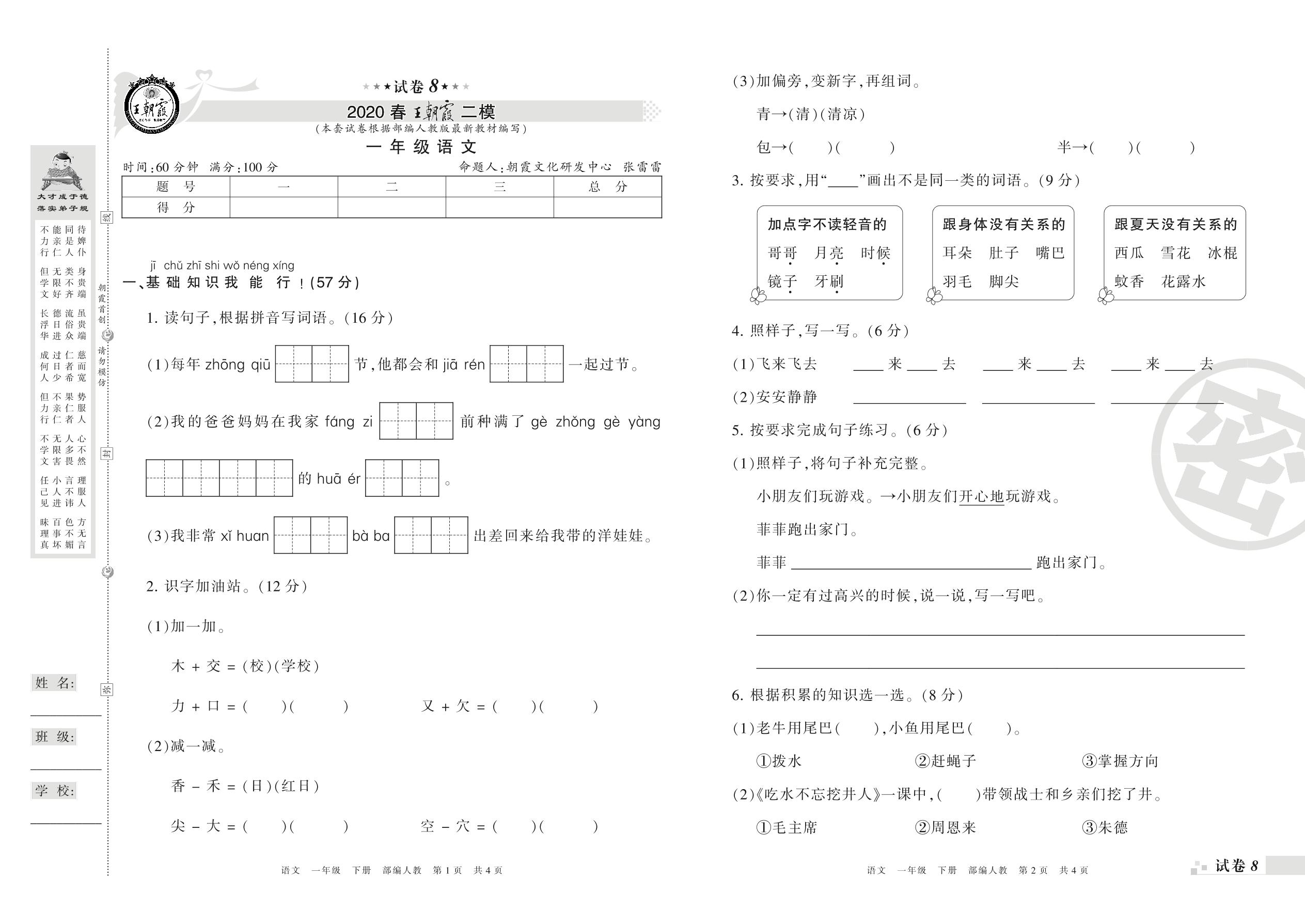 王朝霞期末模拟卷一年级下册语文(人教版)_R210731175456【8】