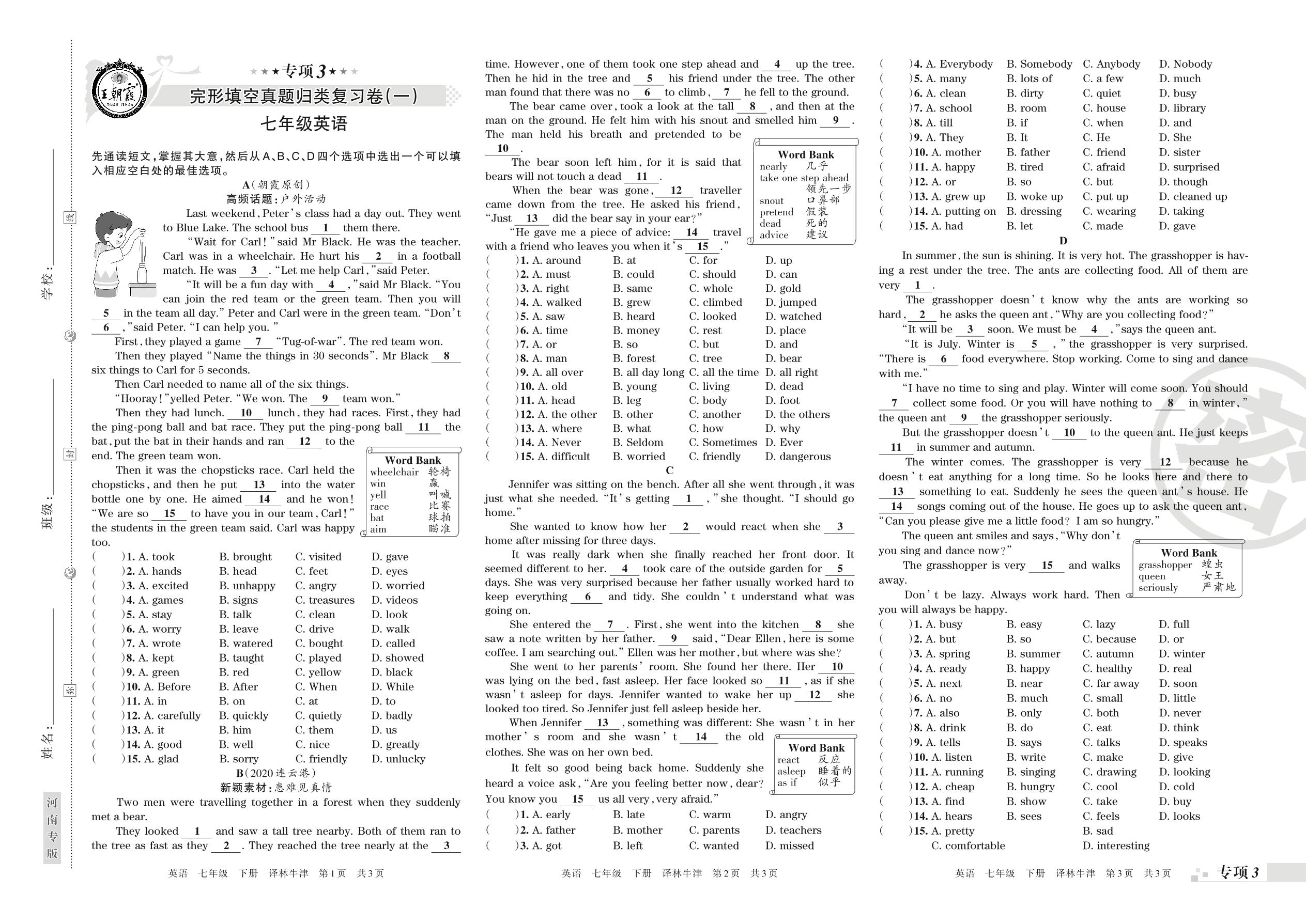 王朝霞期末专项卷——完形填空(一)、(二)真题归类复习七年级下册英语(译林版)【0】