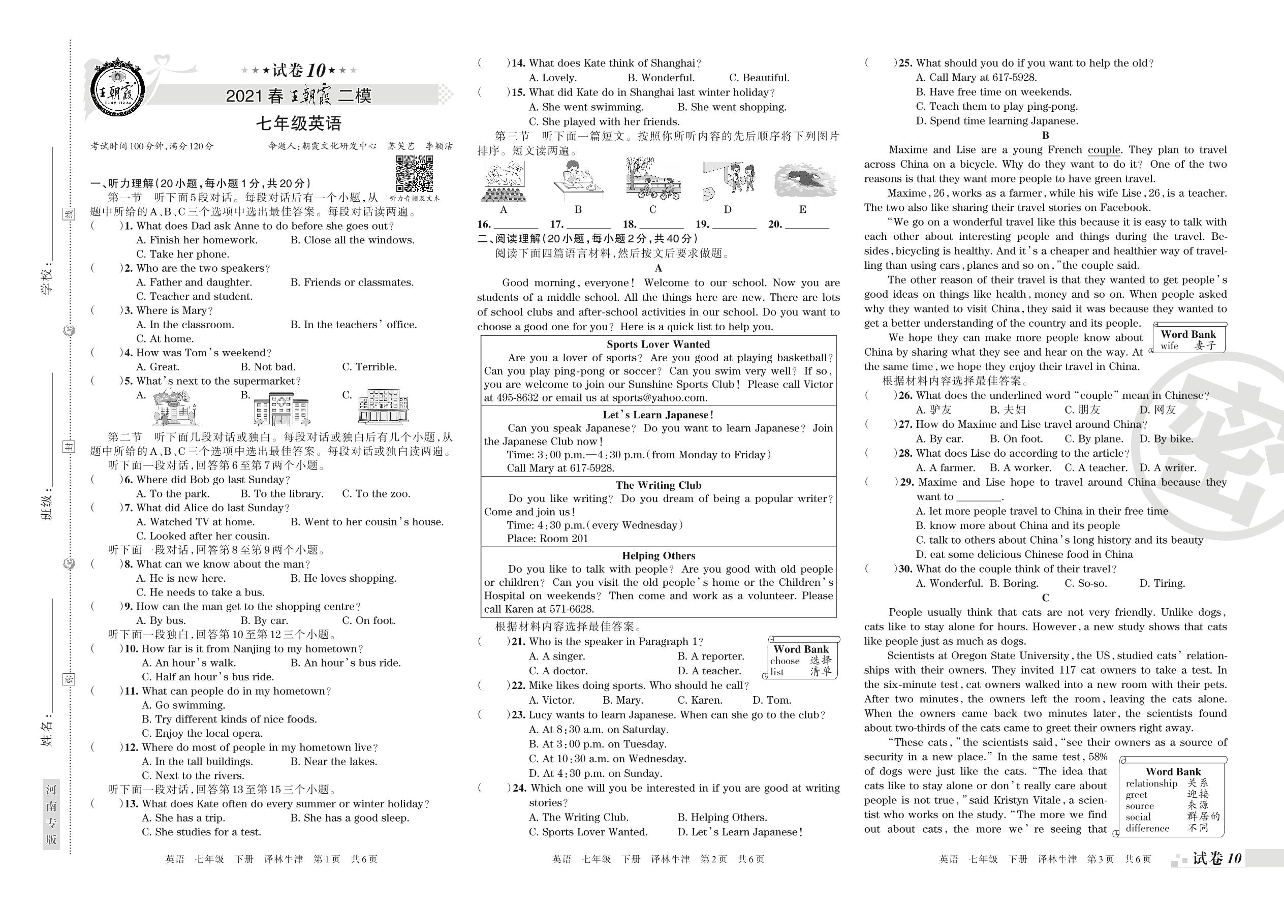 王朝霞期末模拟卷七年级下册英语(译林版)【10】