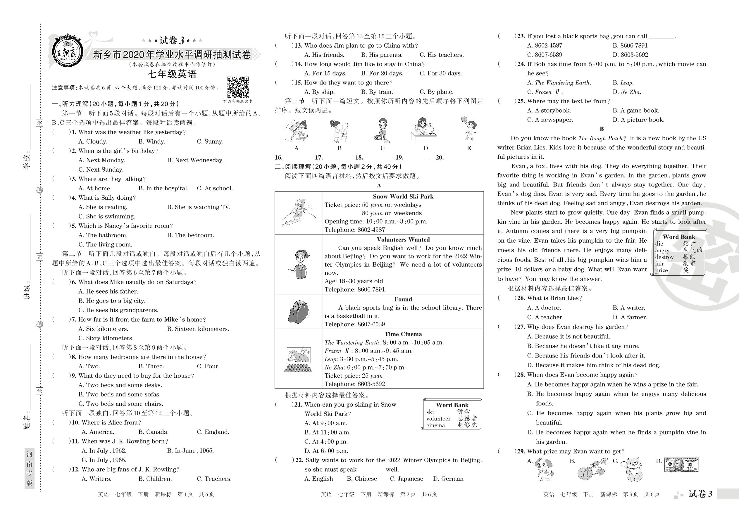 2019-2020学年第二学期新乡市七年级英语试卷(新课版)【3】