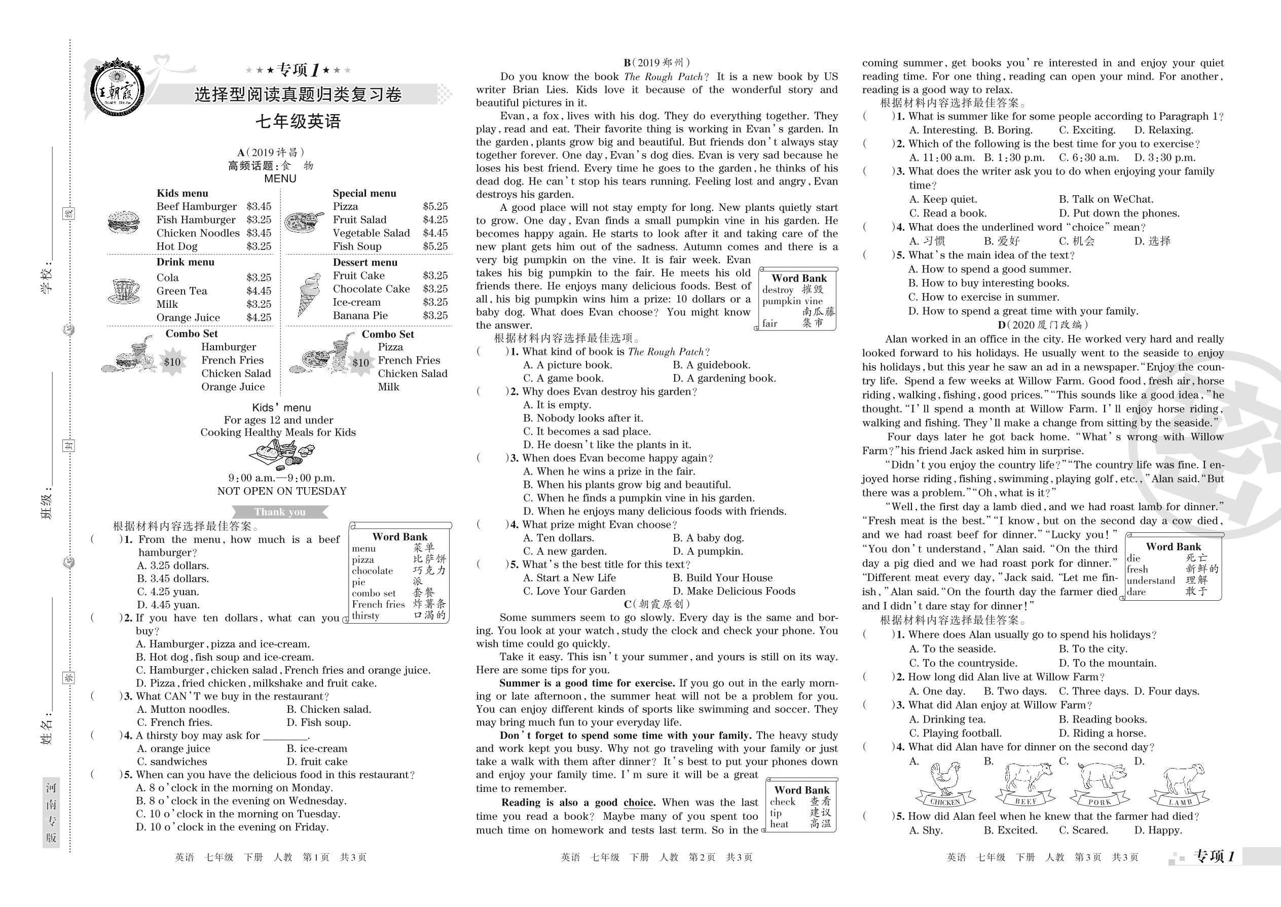 王朝霞期末专项卷——选择型阅读、任务型阅读真题归类复习七年级下册英语(人教版)_R210807182913【0】