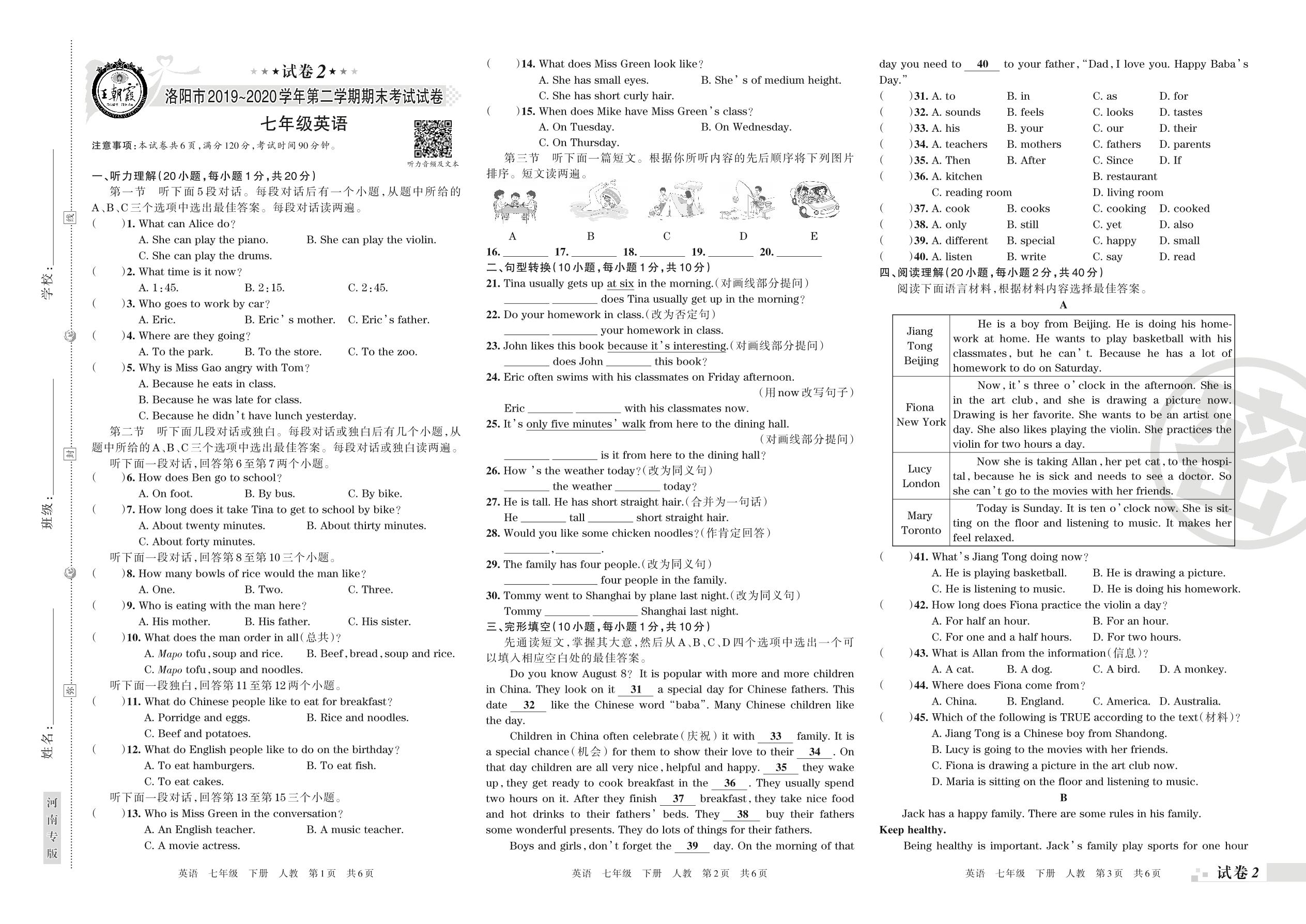 2019-2020学年第二学期洛阳市七年级英语试卷(人教版)【2】