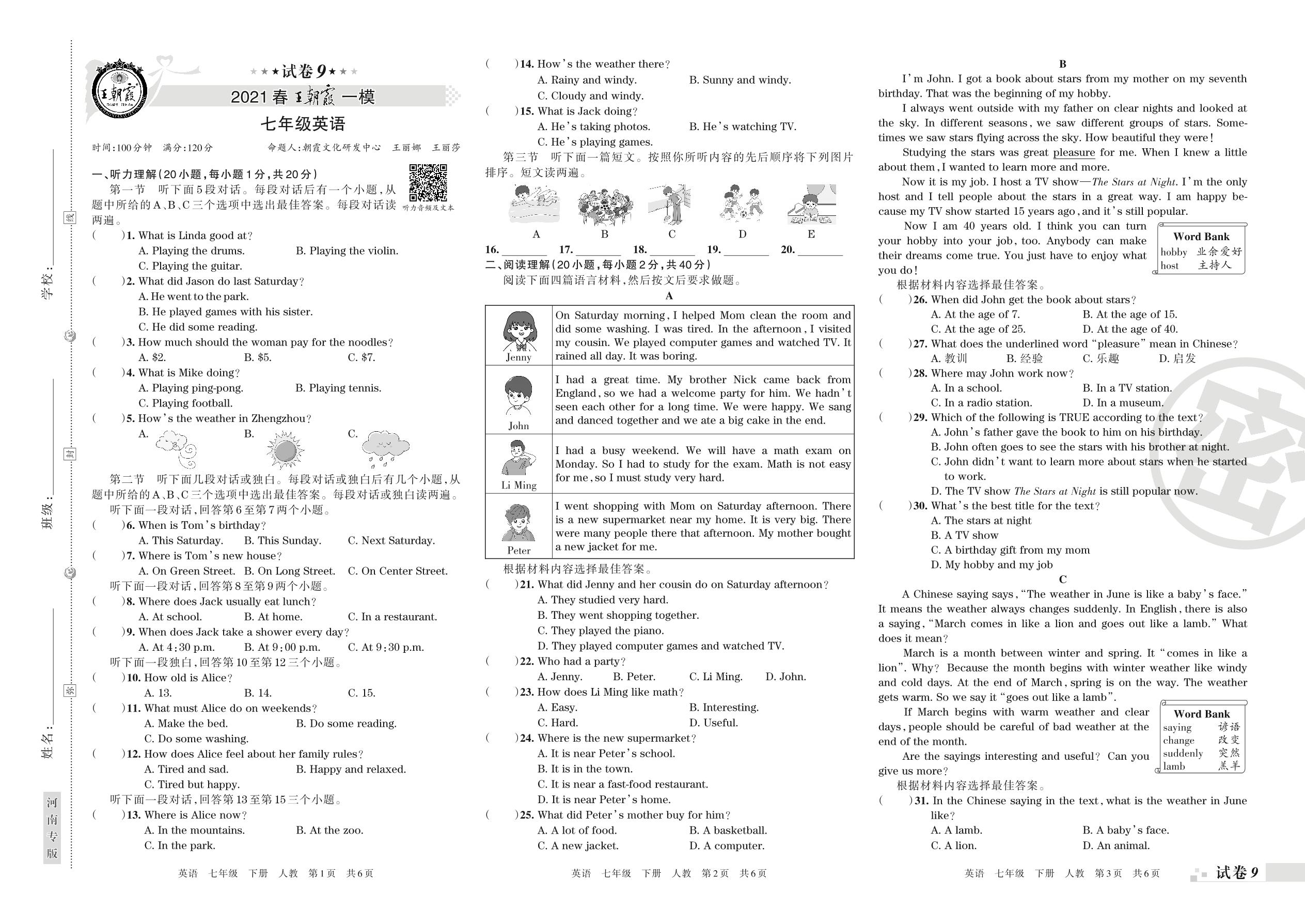 王朝霞期末模拟卷七年级下册英语(人教版)_R210807183102【9】
