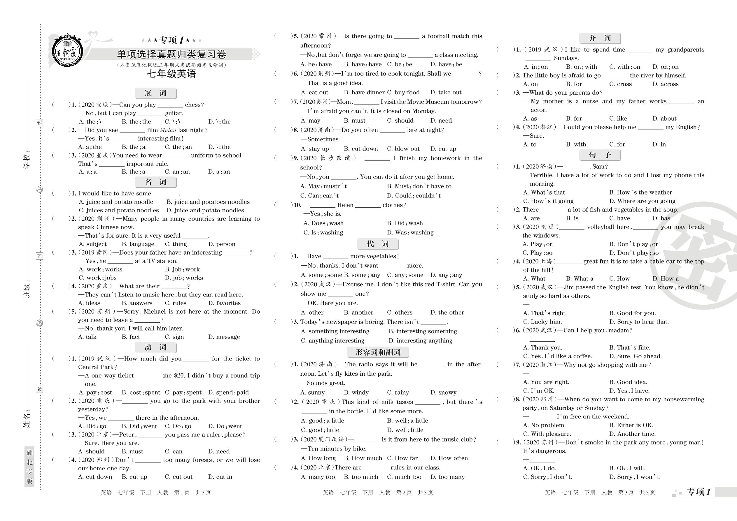王朝霞期末专项卷——单项选择、完形填空真题归类复习七年级下册英语(人教版)_R210807183134【0】