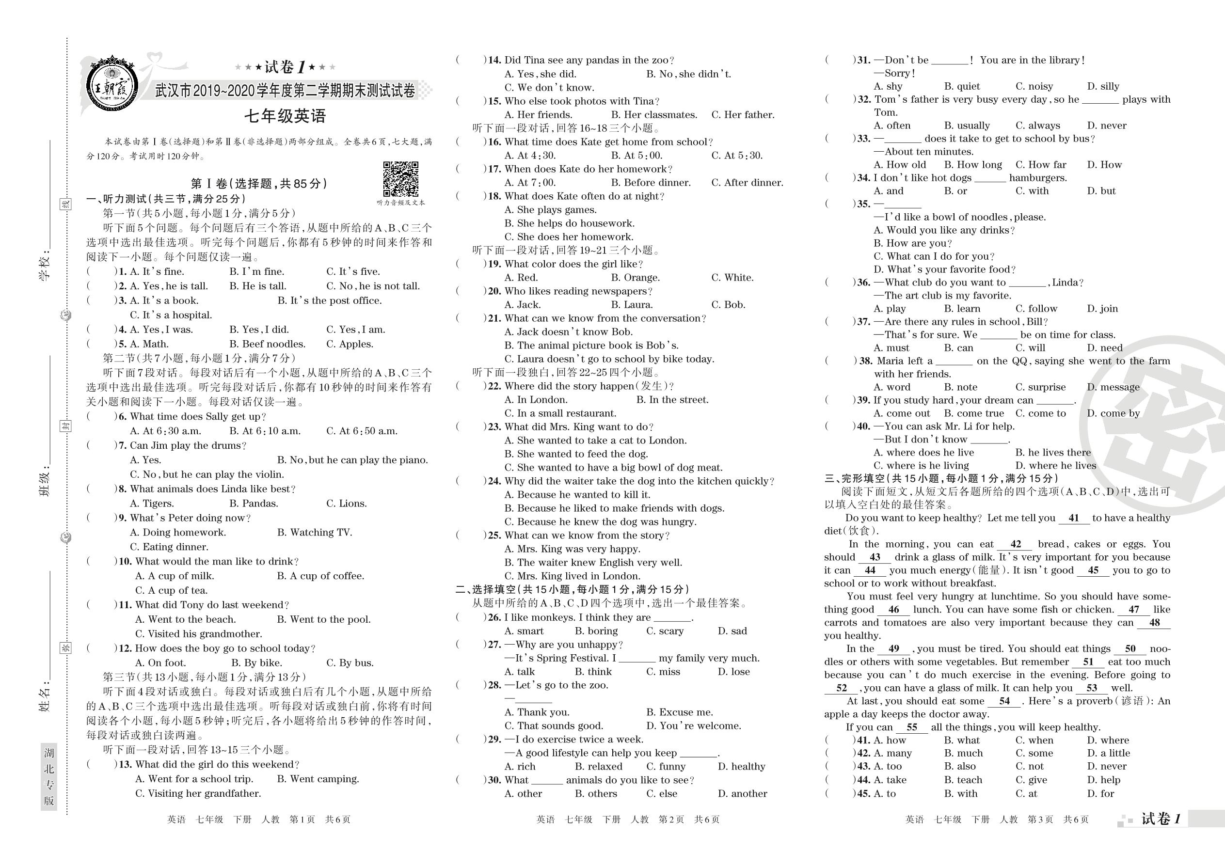 2019-2020学年第二学期武汉市七年级英语试卷(人教版)【1】
