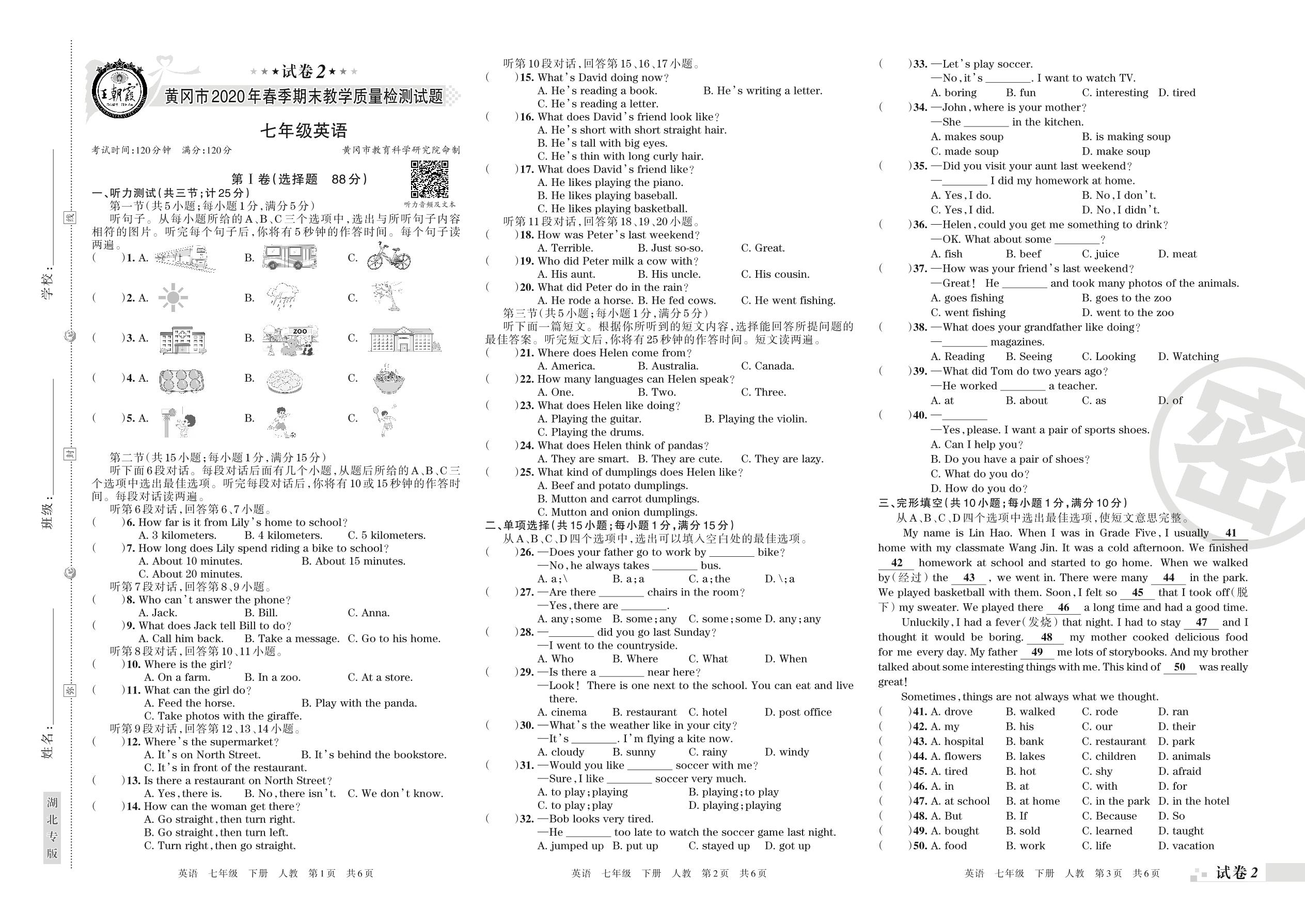 2019-2020学年第二学期黄冈市七年级英语试卷(人教版)【2】
