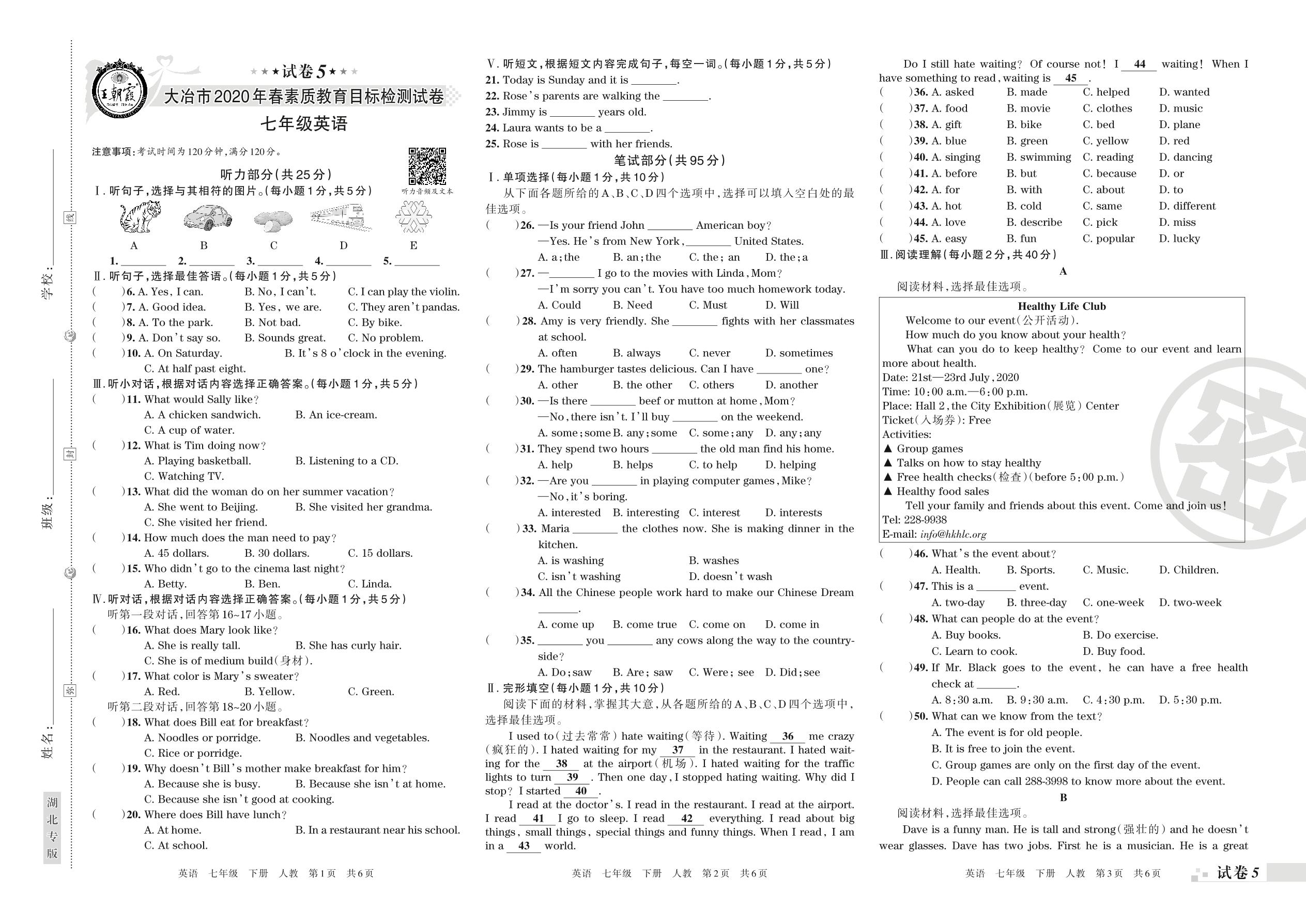 2019-2020学年第二学期大冶市七年级英语试卷(人教版)【5】