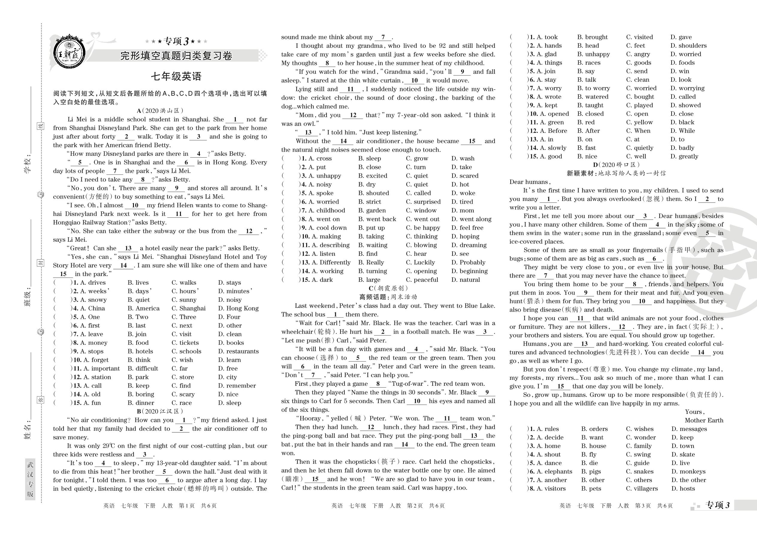 王朝霞期末专项卷——完形填空真题归类复习七年级下册英语(人教版)【0】
