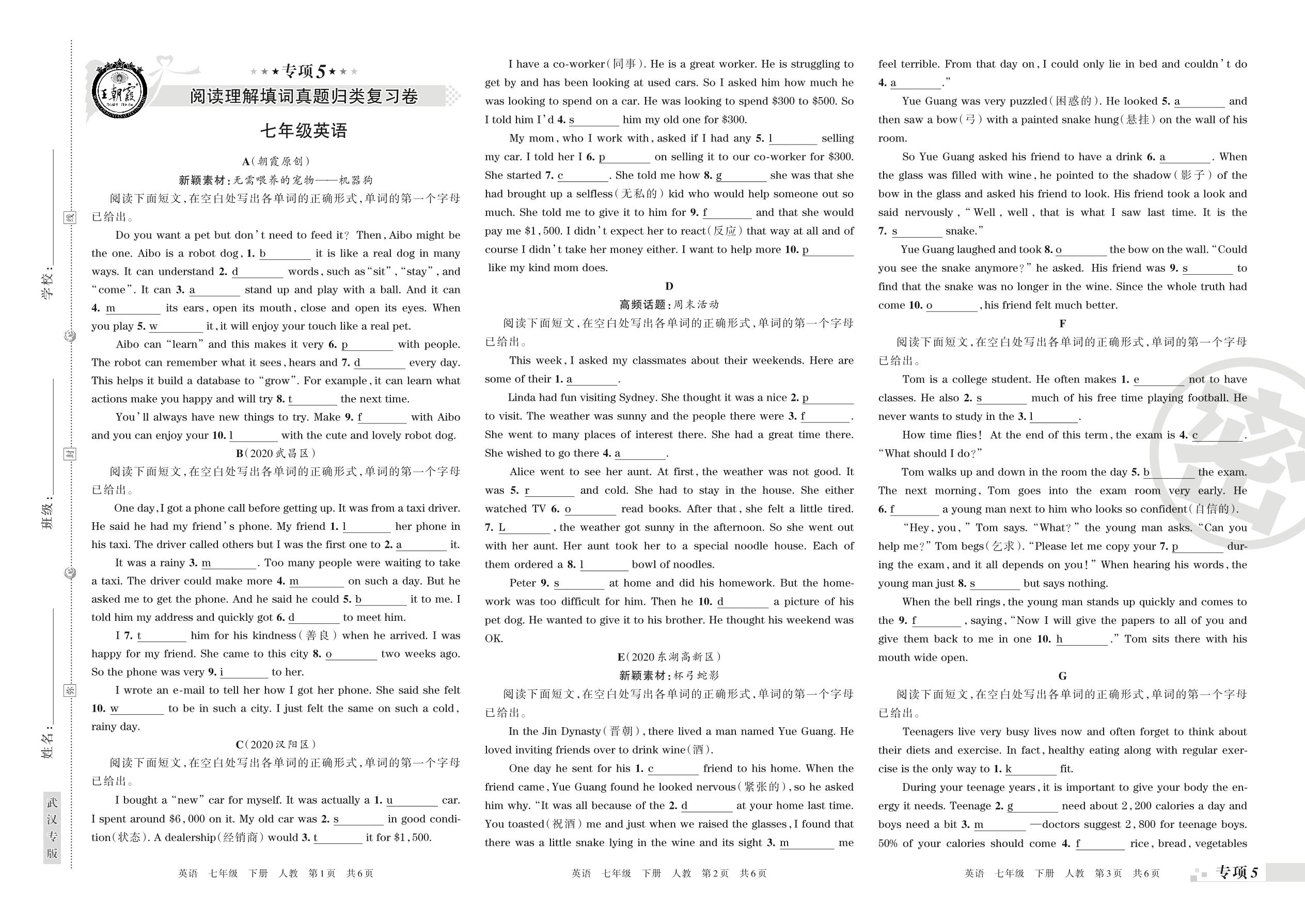 王朝霞期末专项卷——阅读理解填词真题归类复习七年级下册英语(人教版)【0】