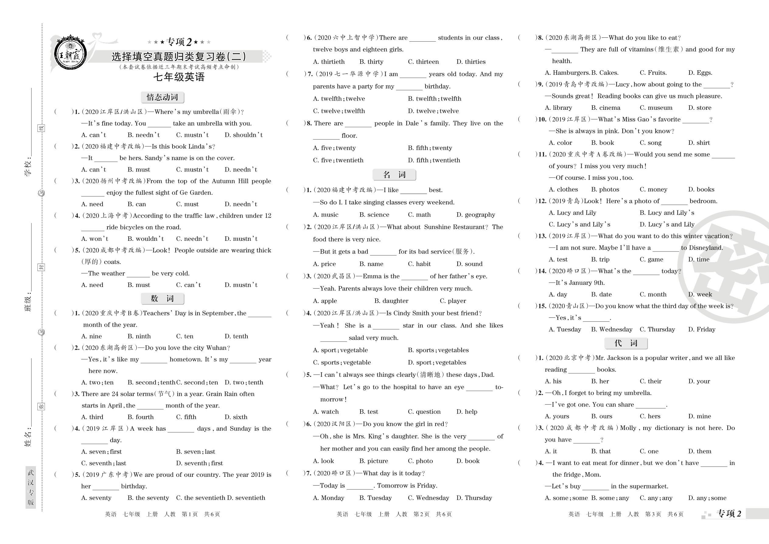 王朝霞期末专项卷——选择填空(二)真题归类复习七年级上册英语(人教版)