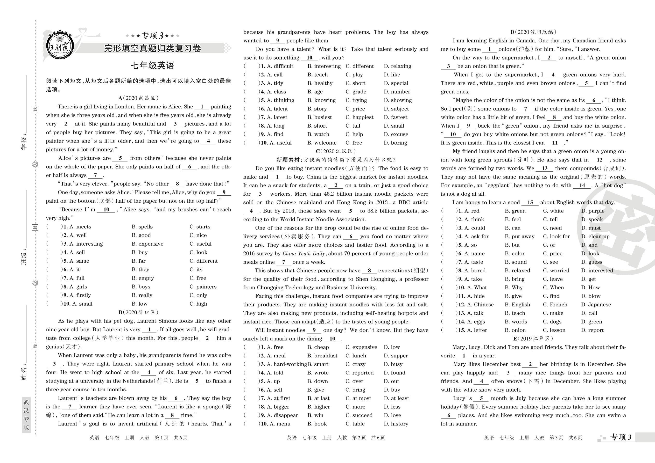 王朝霞期末专项卷——完形填空真题归类复习七年级上册英语(人教版)