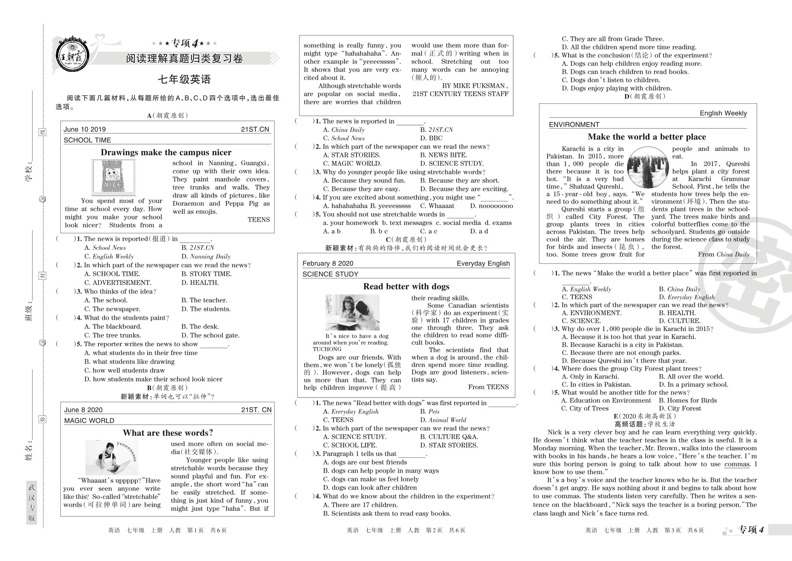 王朝霞期末专项卷——阅读理解真题归类复习七年级上册英语(人教版)