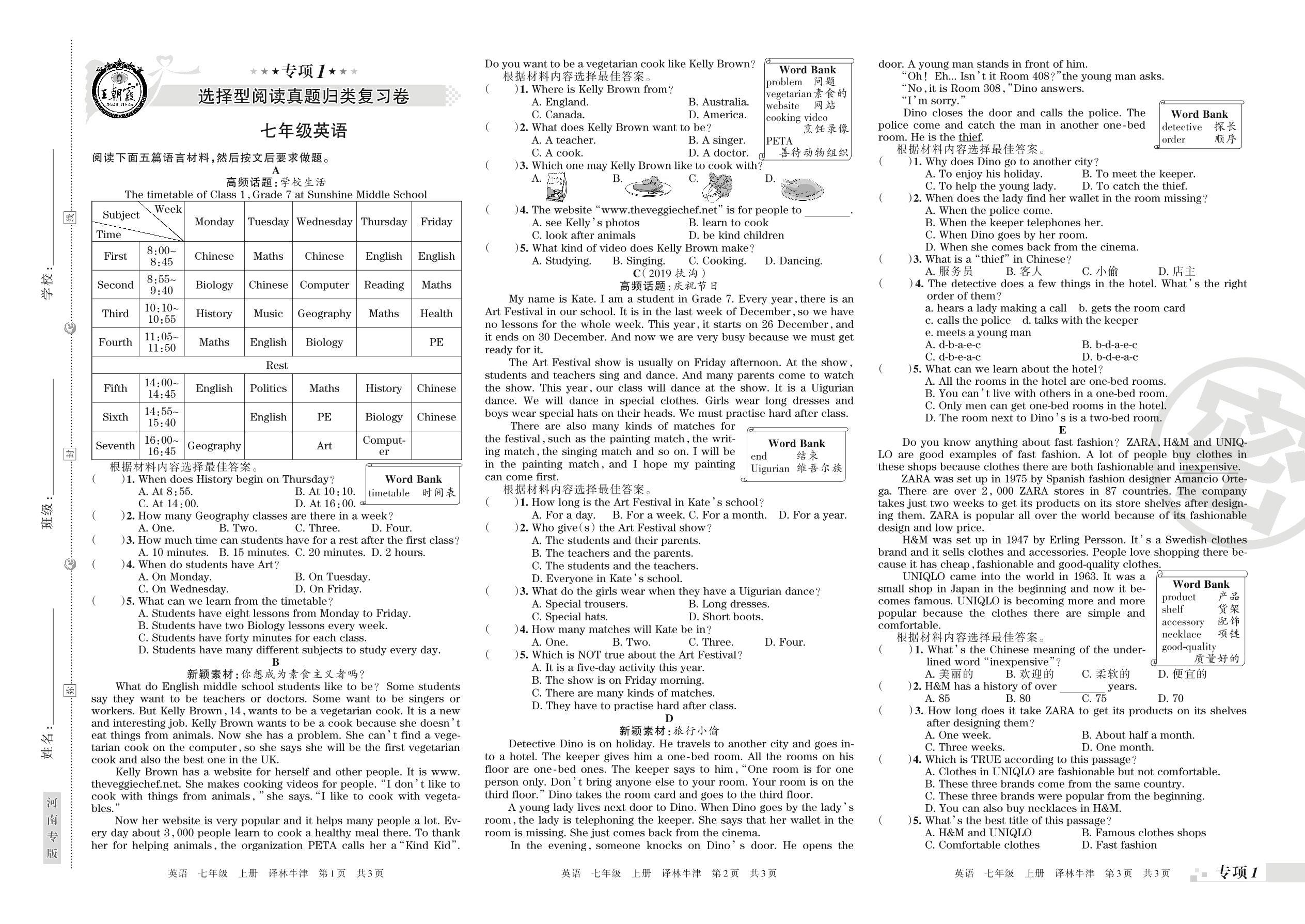 王朝霞期末专项卷——选择型阅读、任务型阅读真题归类复习七年级上册英语(译林版)【0】