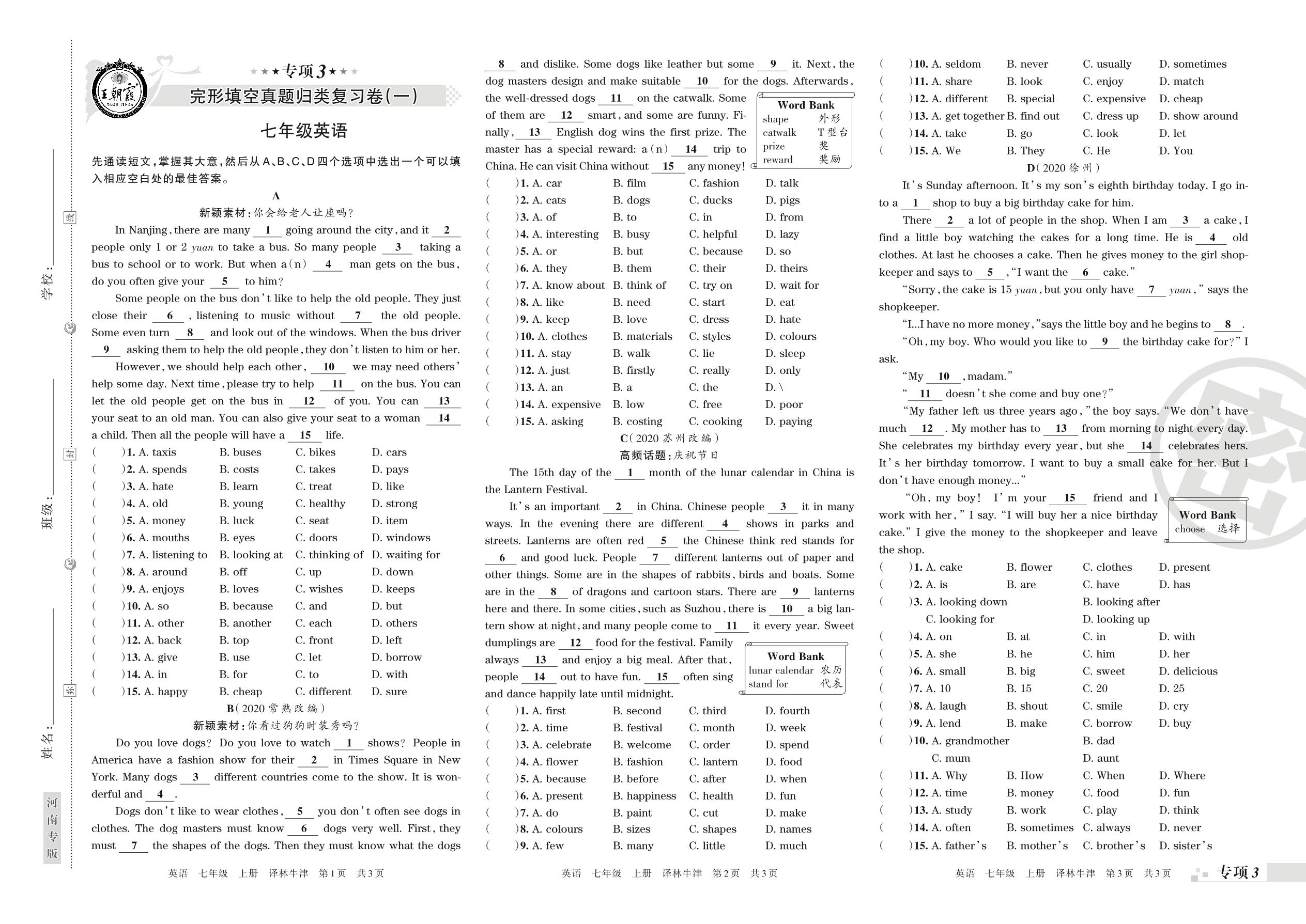 王朝霞期末专项卷——完形填空真题归类复习七年级上册英语(译林版)【0】