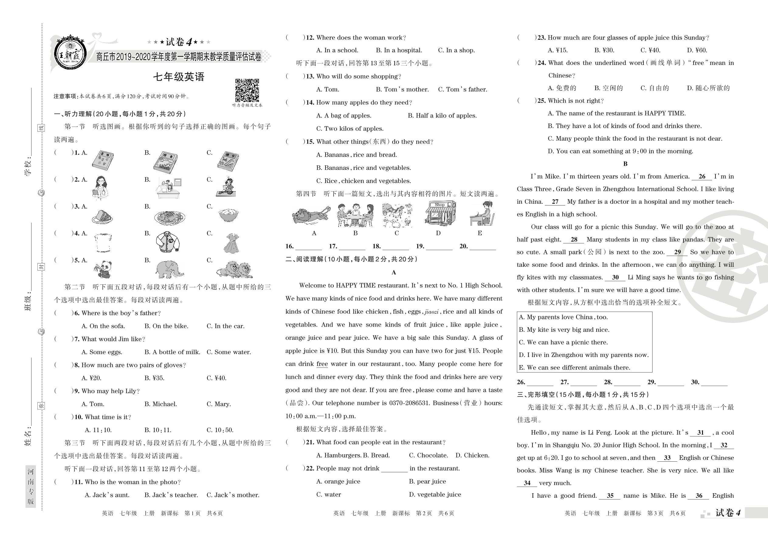 2019-2020学年第一学期商丘市七年级英语试卷(新课版)【4】