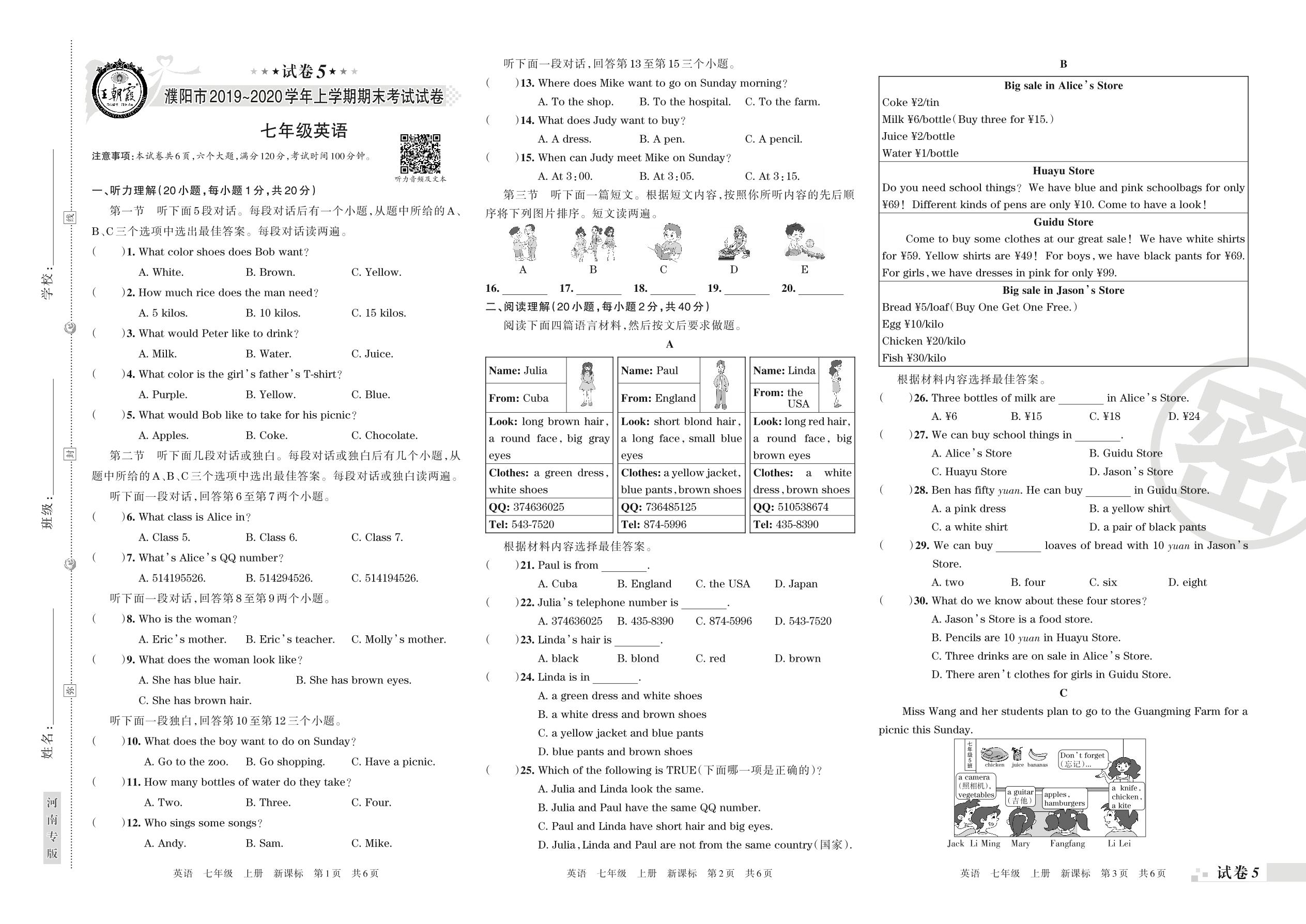 2019-2020学年第一学期濮阳市七年级英语试卷(新课版)【5】