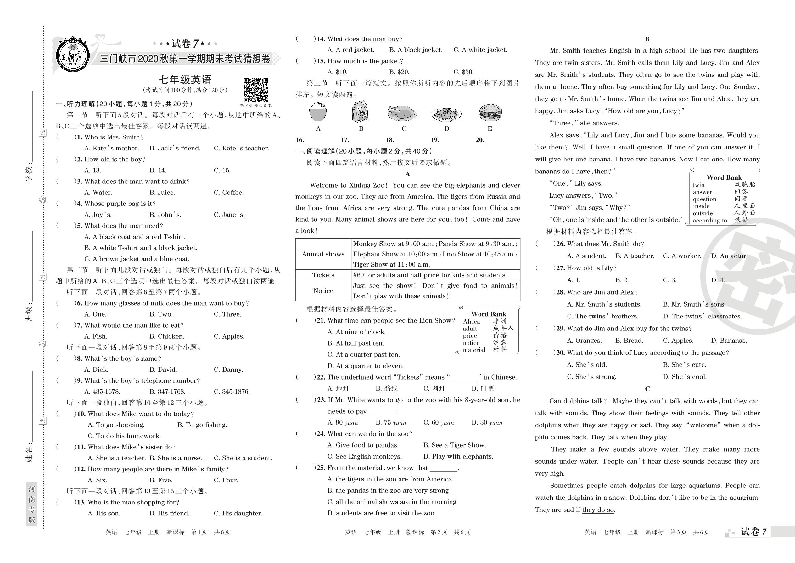 2019-2020学年第一学期三门峡市七年级英语试卷(新课版)【7】