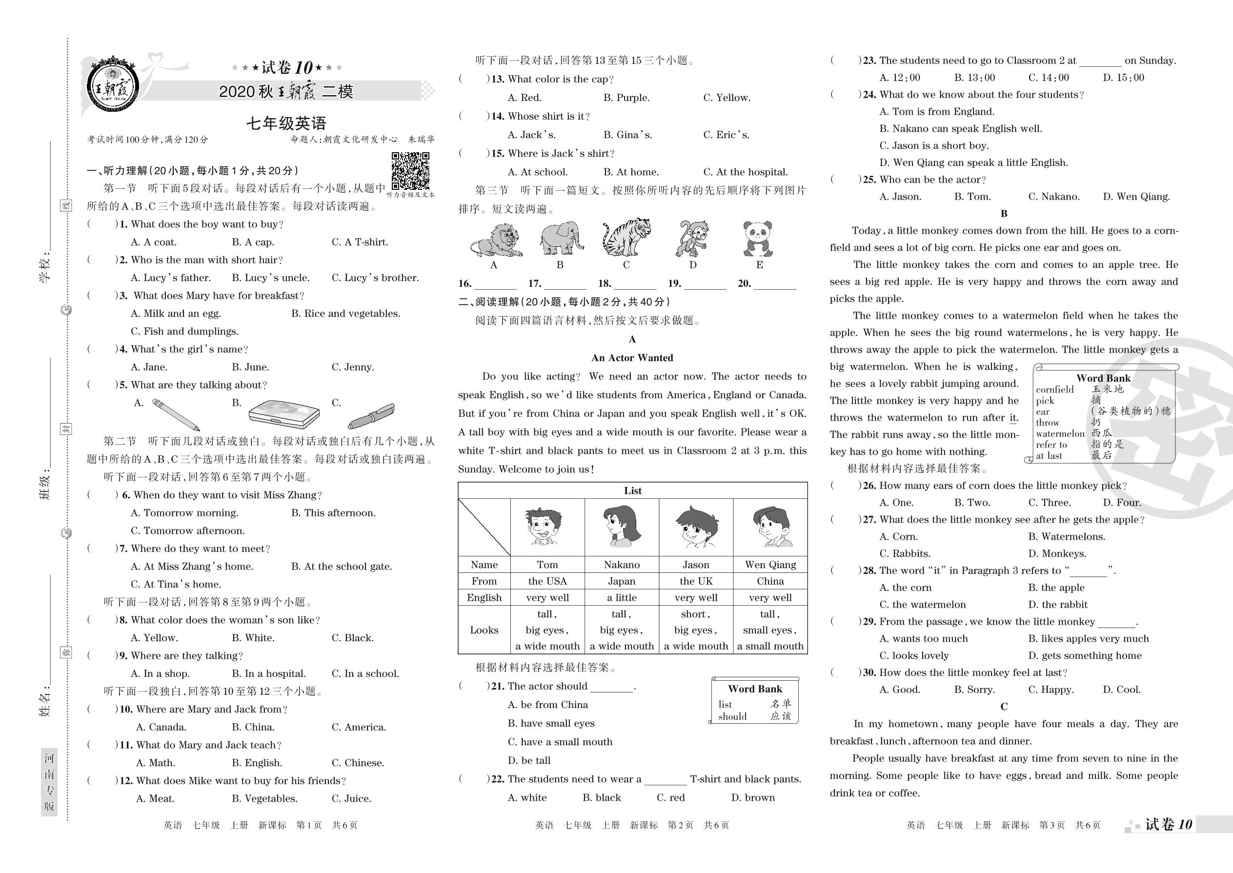 王朝霞期末模拟卷七年级上册英语(新课版)_R210807184112【10】