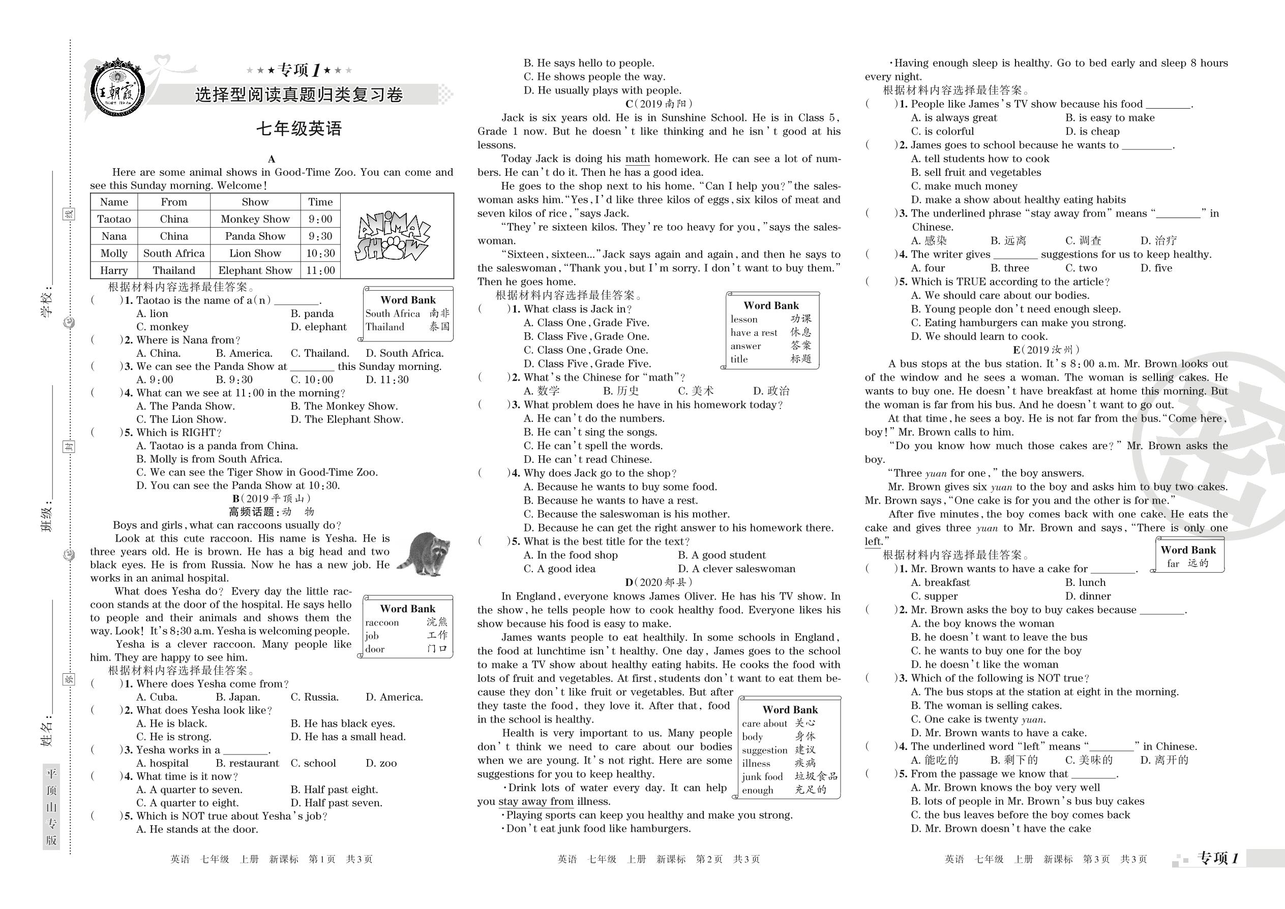王朝霞期末专项卷——选择型阅读、任务型阅读真题归类复习七年级上册英语(新课版)