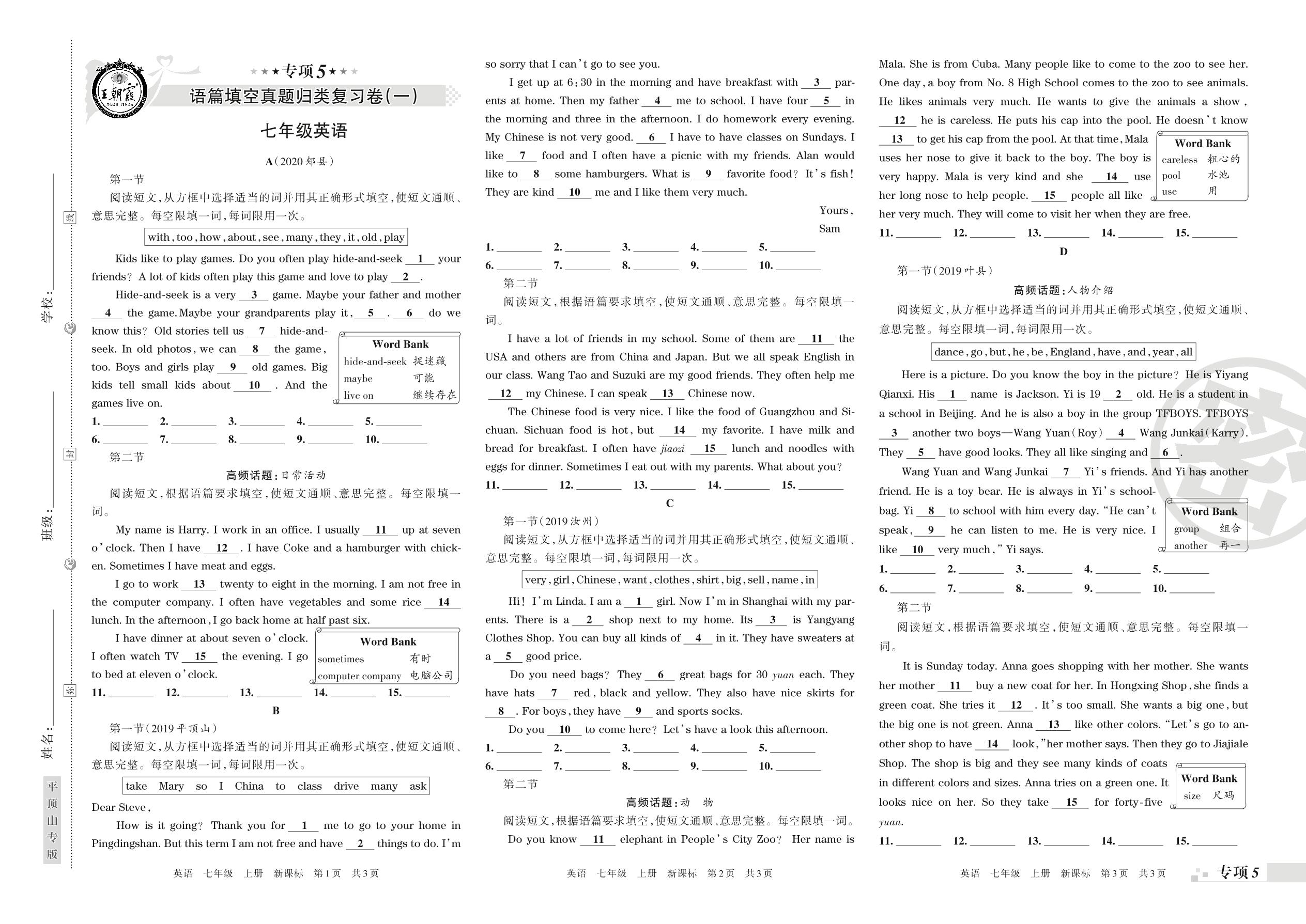王朝霞期末专项卷——语篇填空真题归类复习七年级上册英语(新课版)