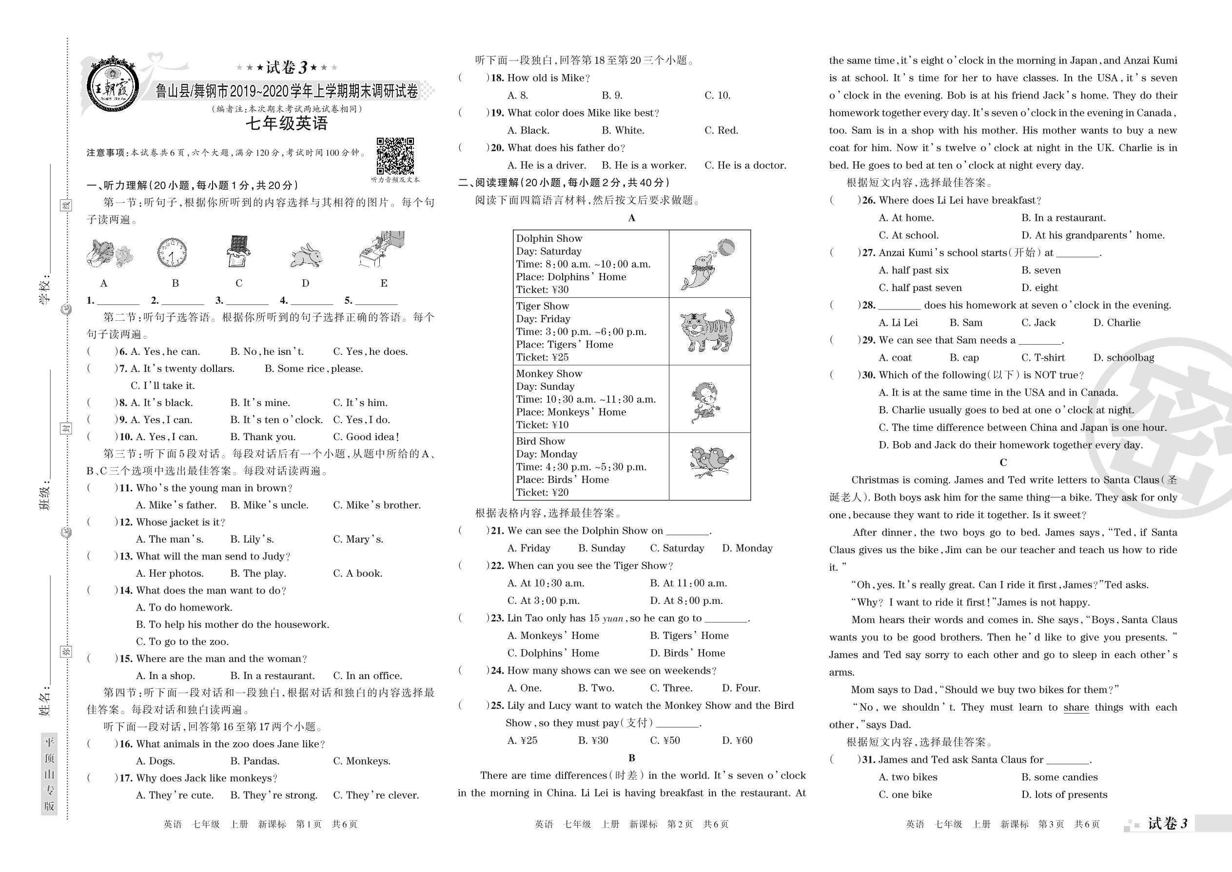 2019-2020学年第一学期鲁山县、舞钢市七年级英语试卷(新课版)【3】