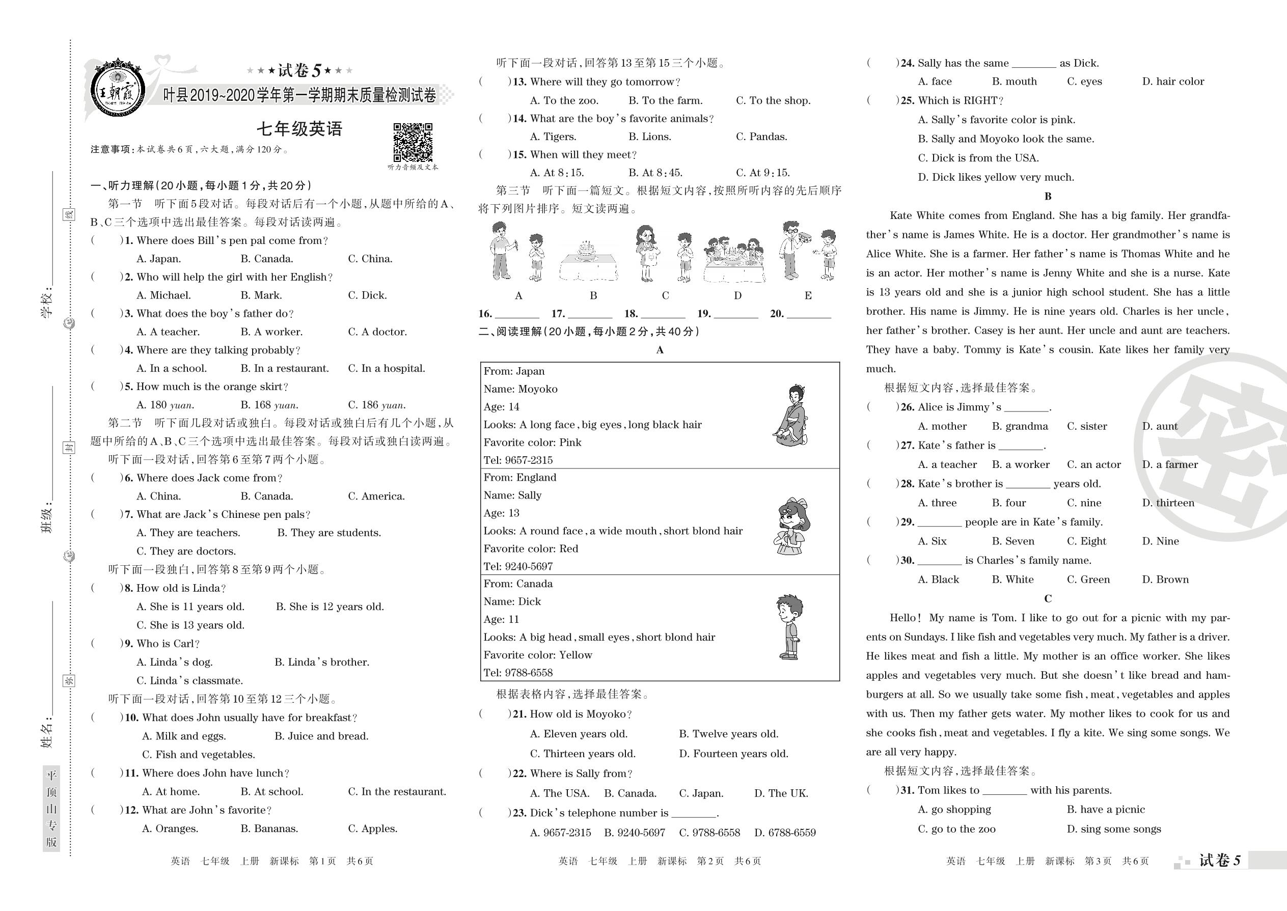 2019-2020学年第一学期平顶山市叶县七年级英语试卷(新课版)【5】