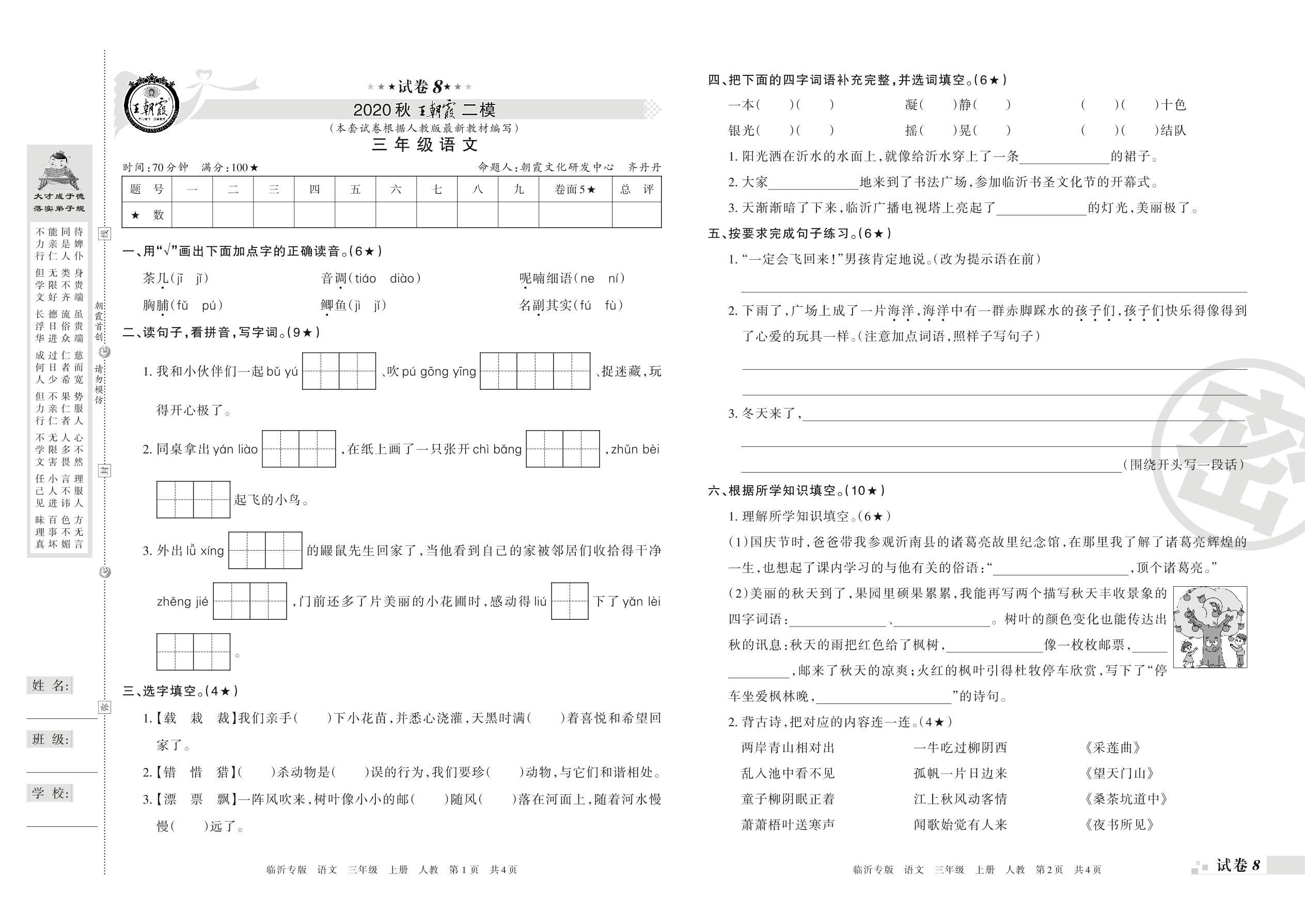 王朝霞期末模拟卷三年级上册语文(人教版)_R21080185045【8】