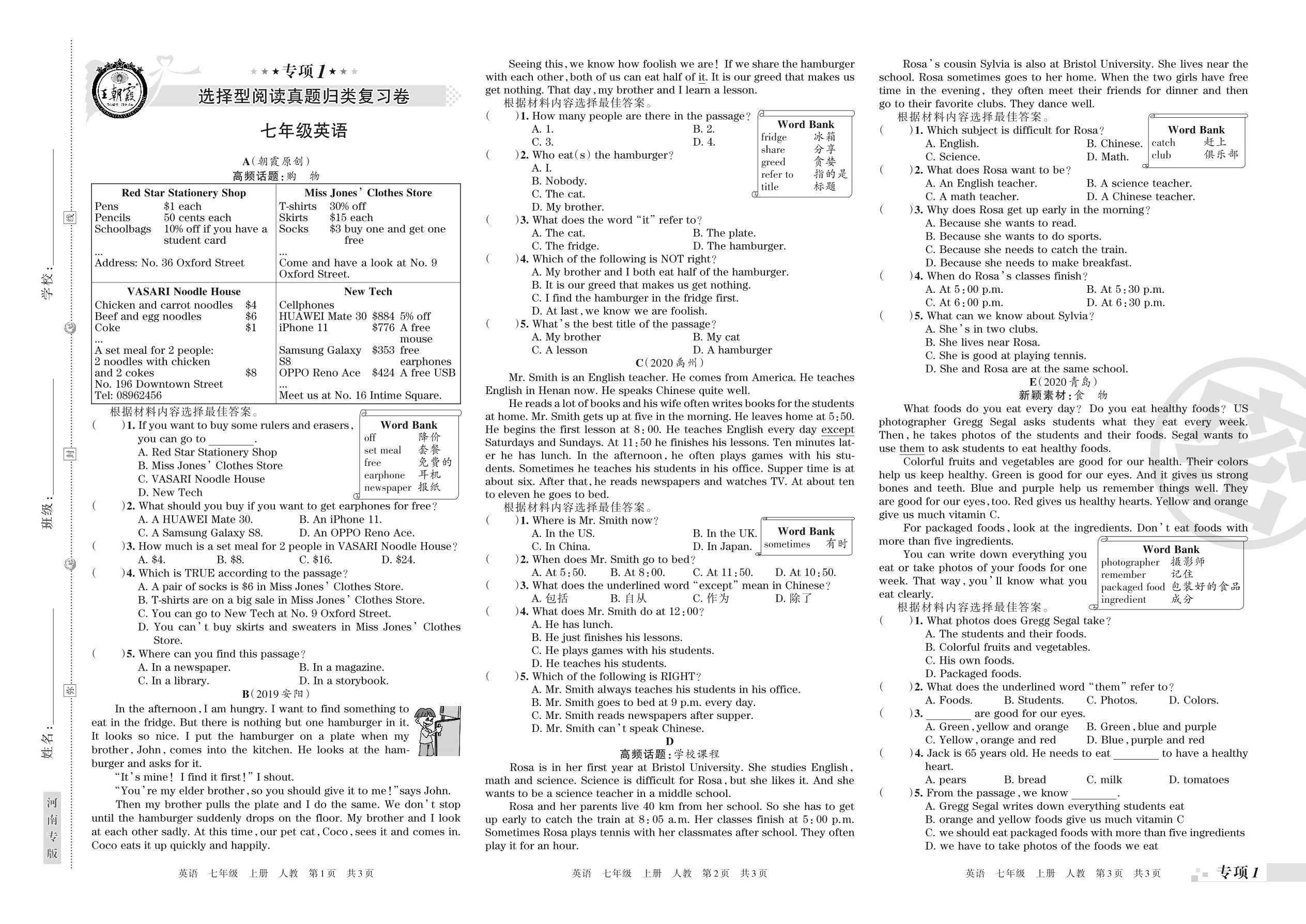王朝霞期末专项卷——选择型阅读、任务型阅读真题归类复习七年级上册英语(人教版)【0】