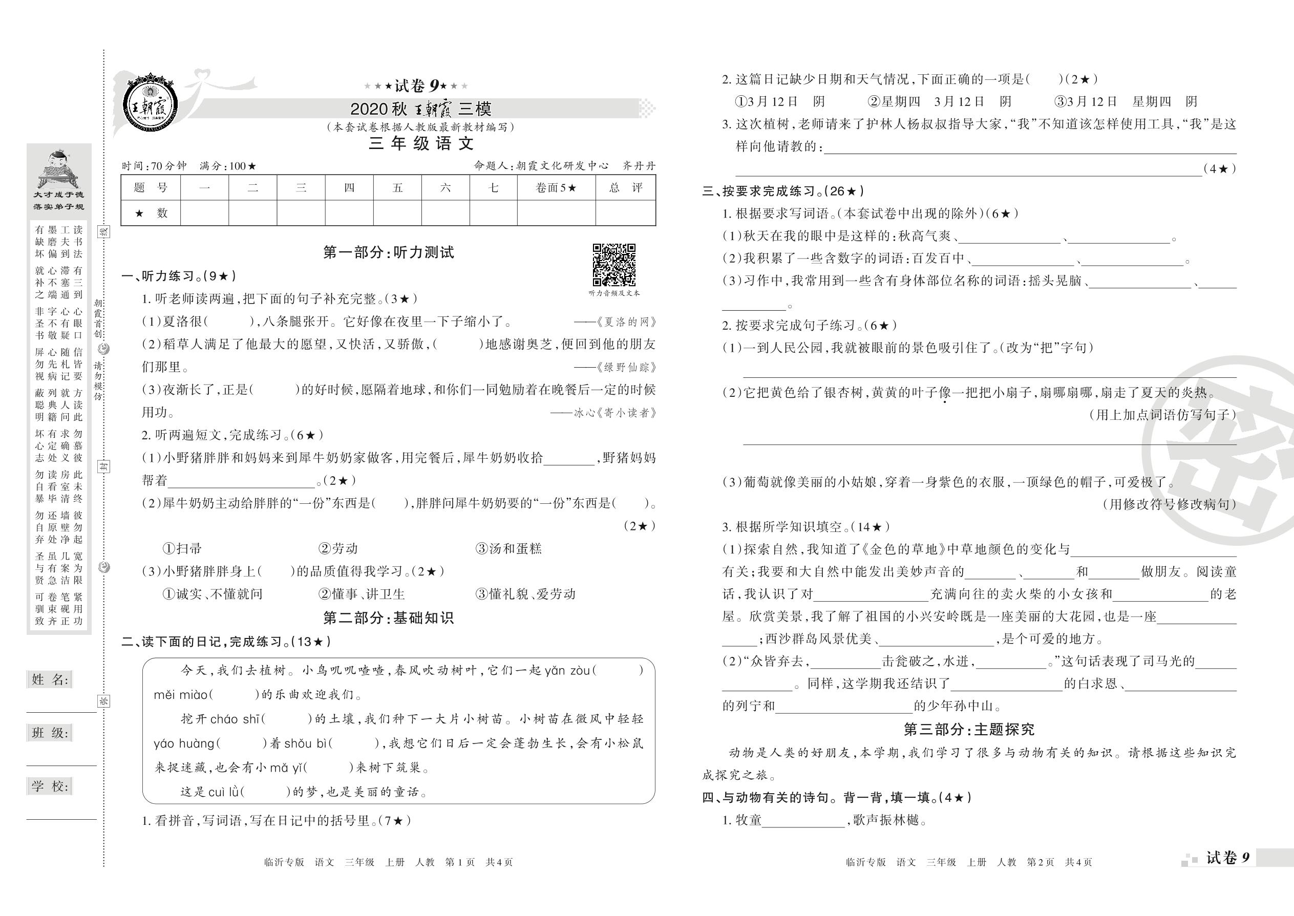 王朝霞期末模拟卷三年级上册语文(人教版)_R21080185048【9】