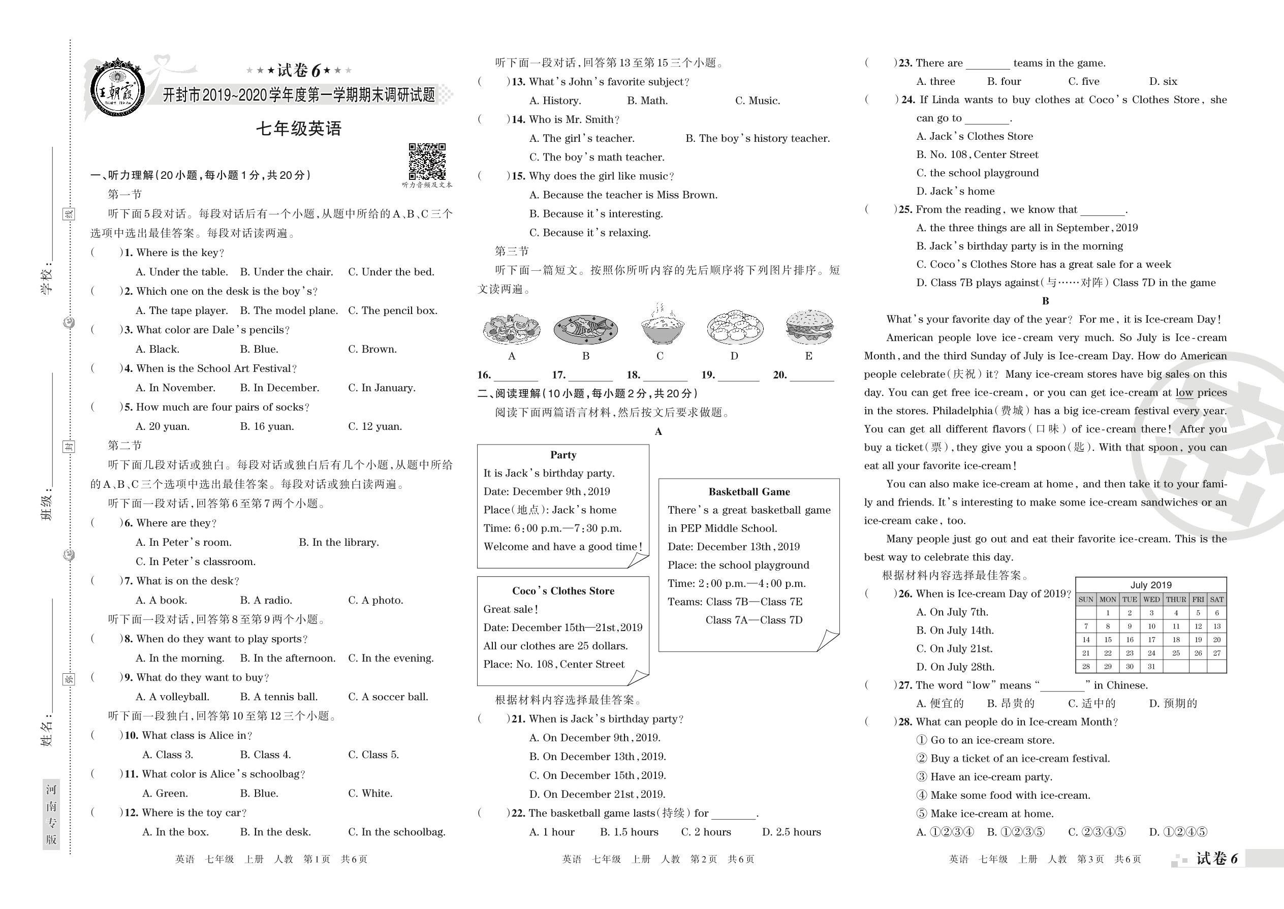 2019-2020学年第一学期开封市七年级英语试卷(人教版)【6】