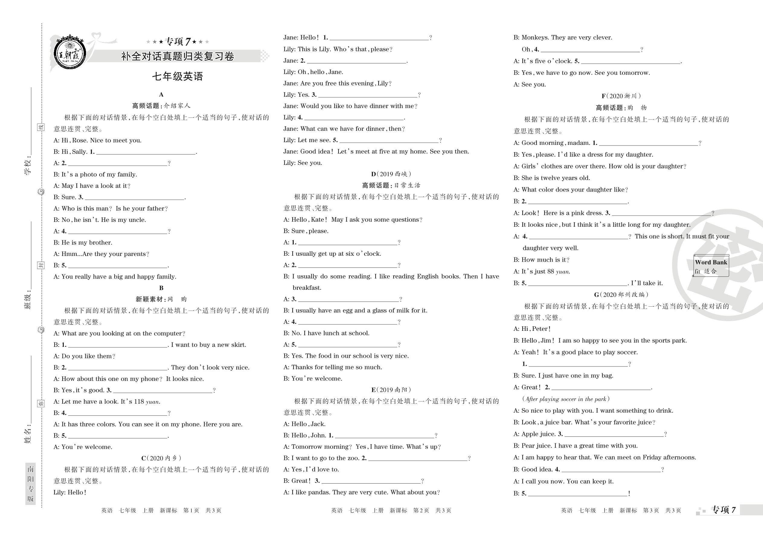 王朝霞期末专项卷——补全对话、书面表达真题归类复习七年级上册英语(新课版)【0】
