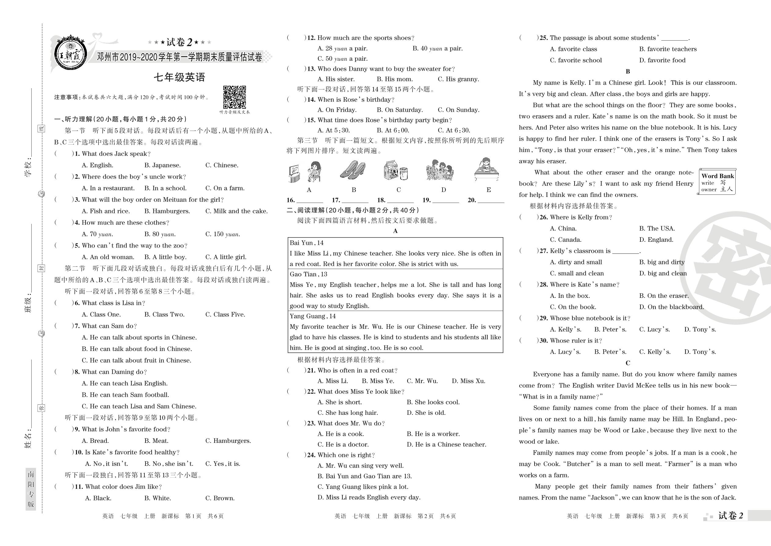 2019-2020学年第一学期邓州市七年级英语试卷(新课版)【2】