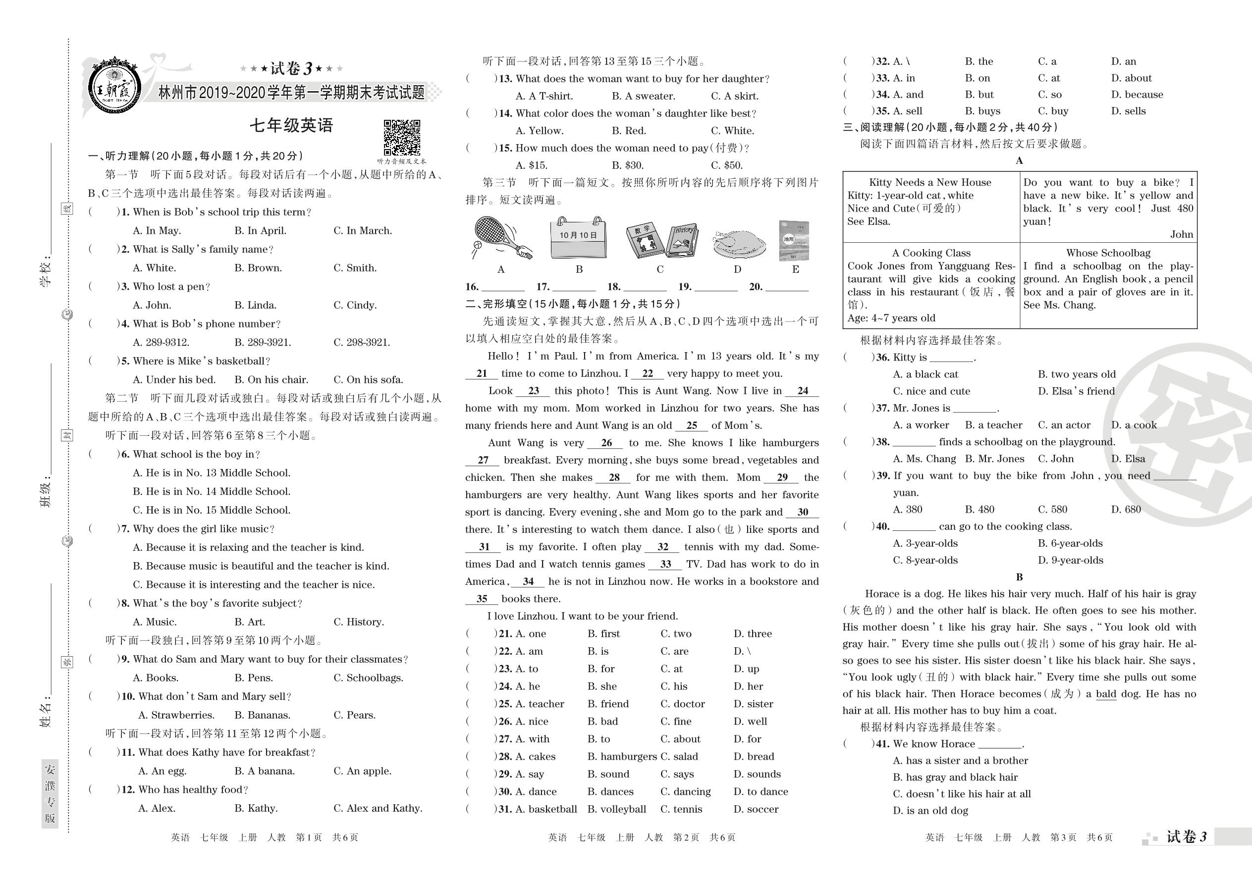 2019-2020学年第一学期林州市七年级英语试卷(人教版)【3】