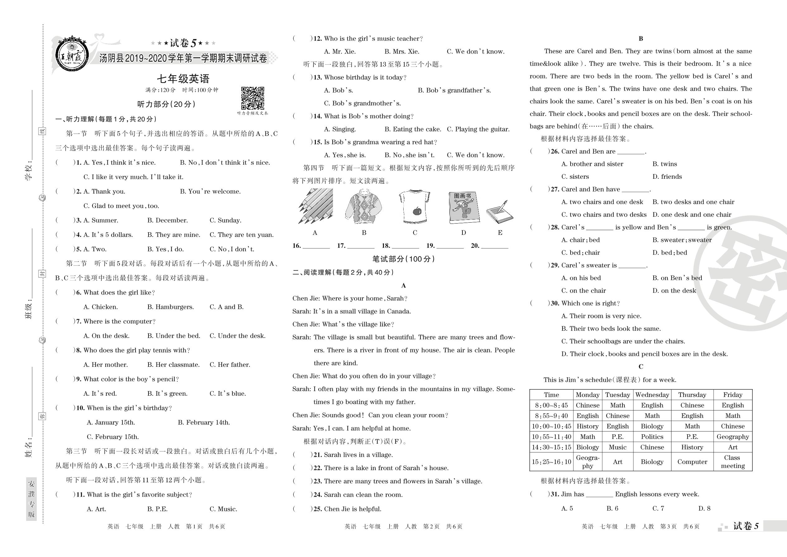 2019-2020学年第一学期安阳市汤阴县七年级英语试卷(人教版)【5】