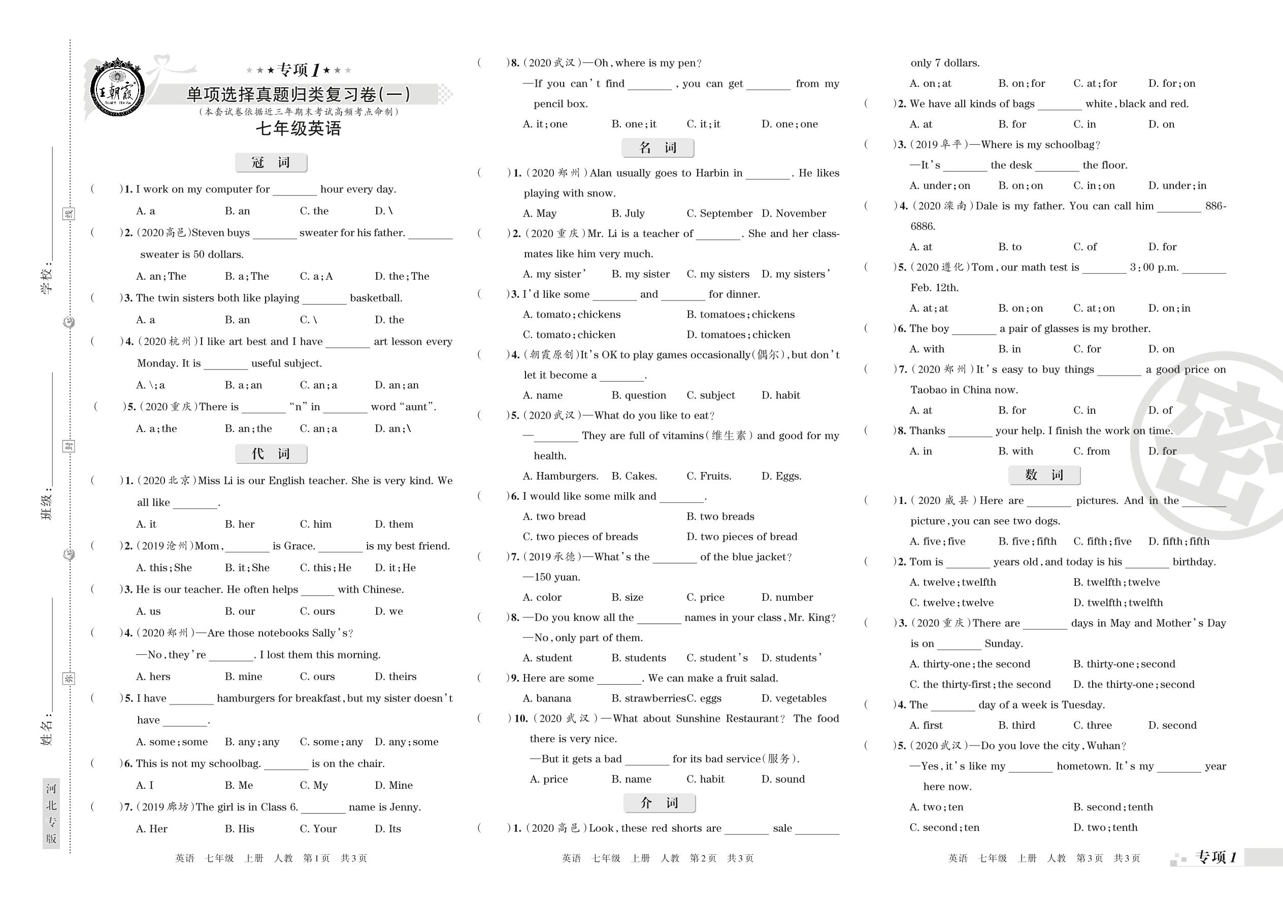 王朝霞期末专项卷——单项选择真题归类复习七年级上册英语(人教版)【0】