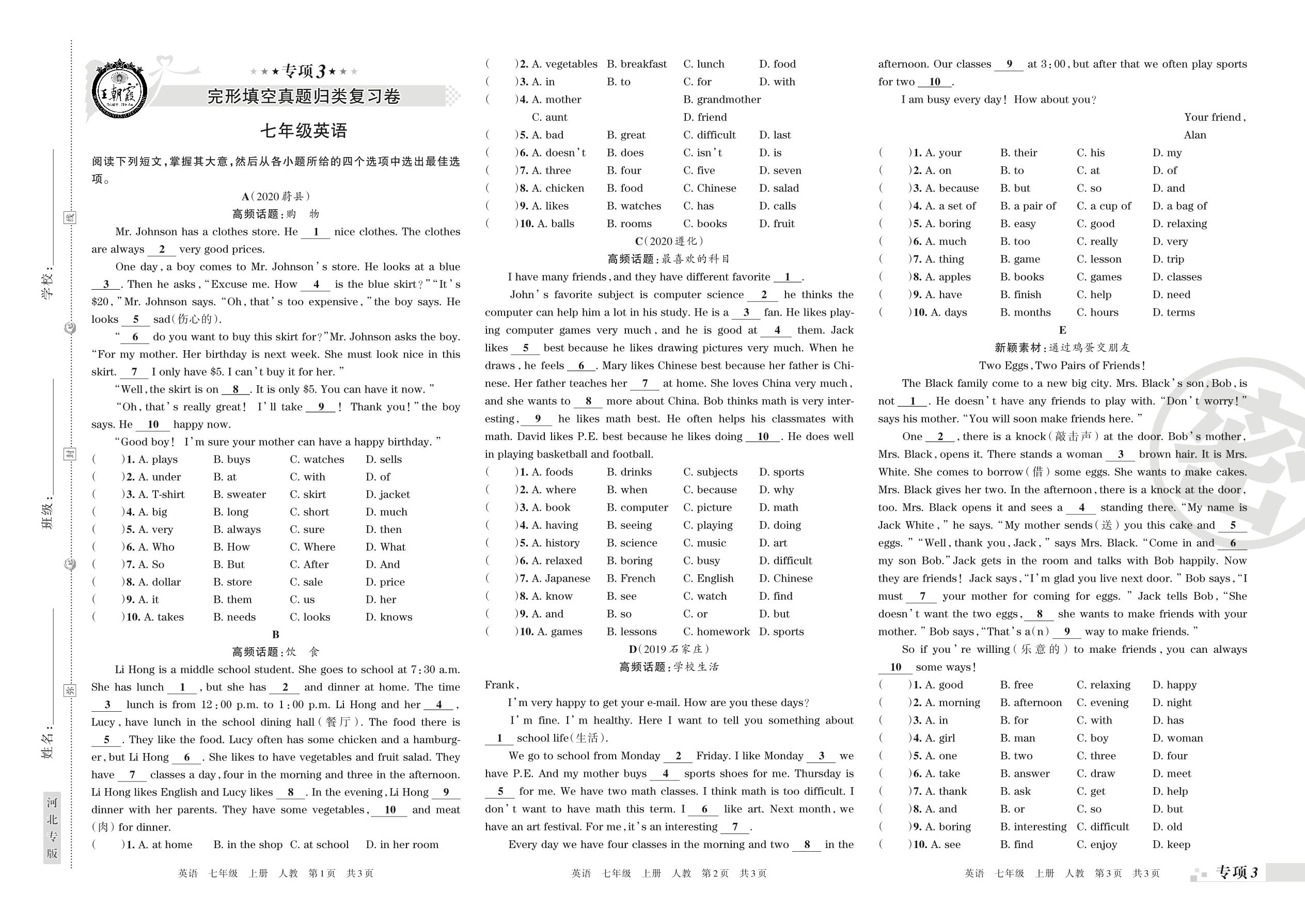 王朝霞期末专项卷——完形填空、阅读理解真题归类复习七年级上册英语(人教版)【0】
