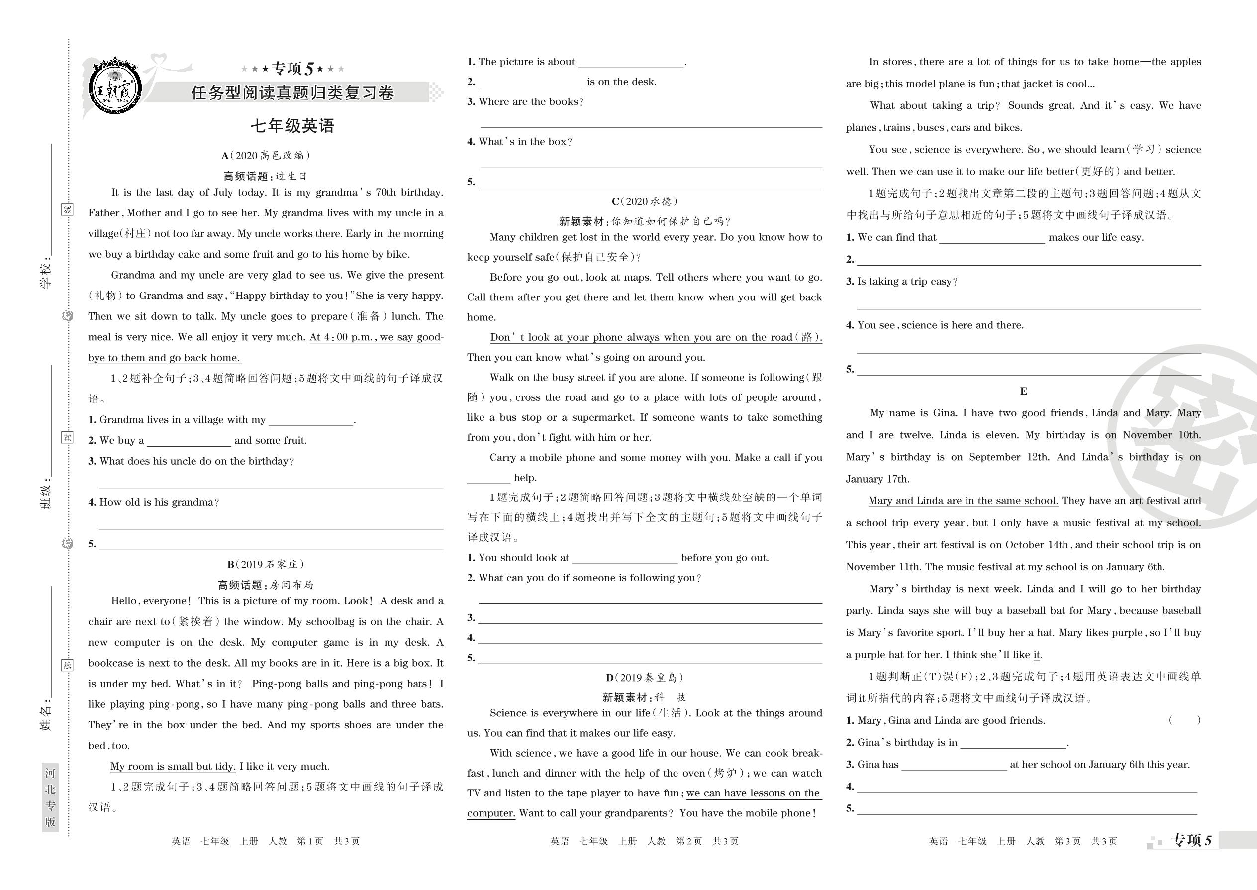 王朝霞期末专项卷——任务型阅读、词语运用真题归类复习七年级上册英语(人教版)【0】