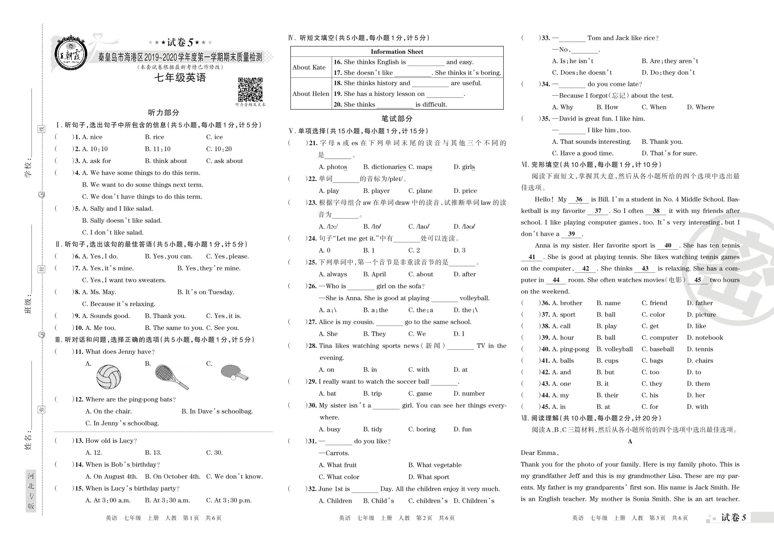 2019-2020学年第一学期秦皇岛市海港区七年级英语试卷(人教版)【5】