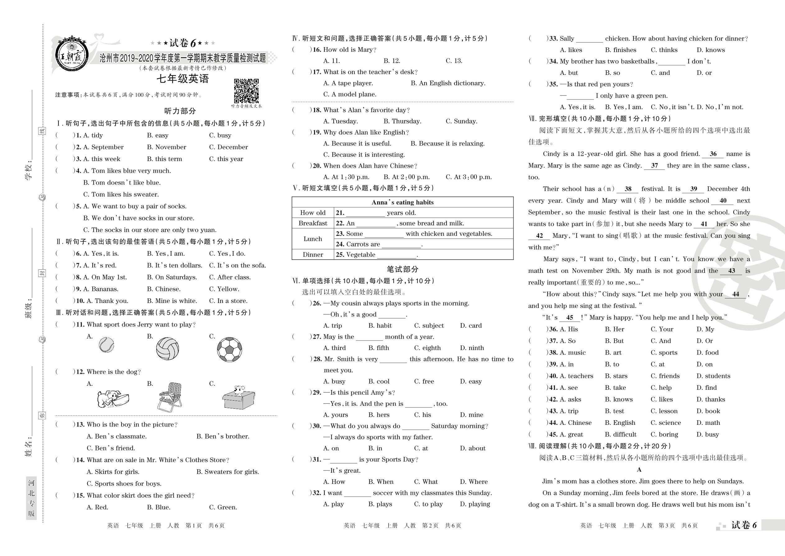 2019-2020学年第一学期沧州市七年级英语试卷(人教版)【6】