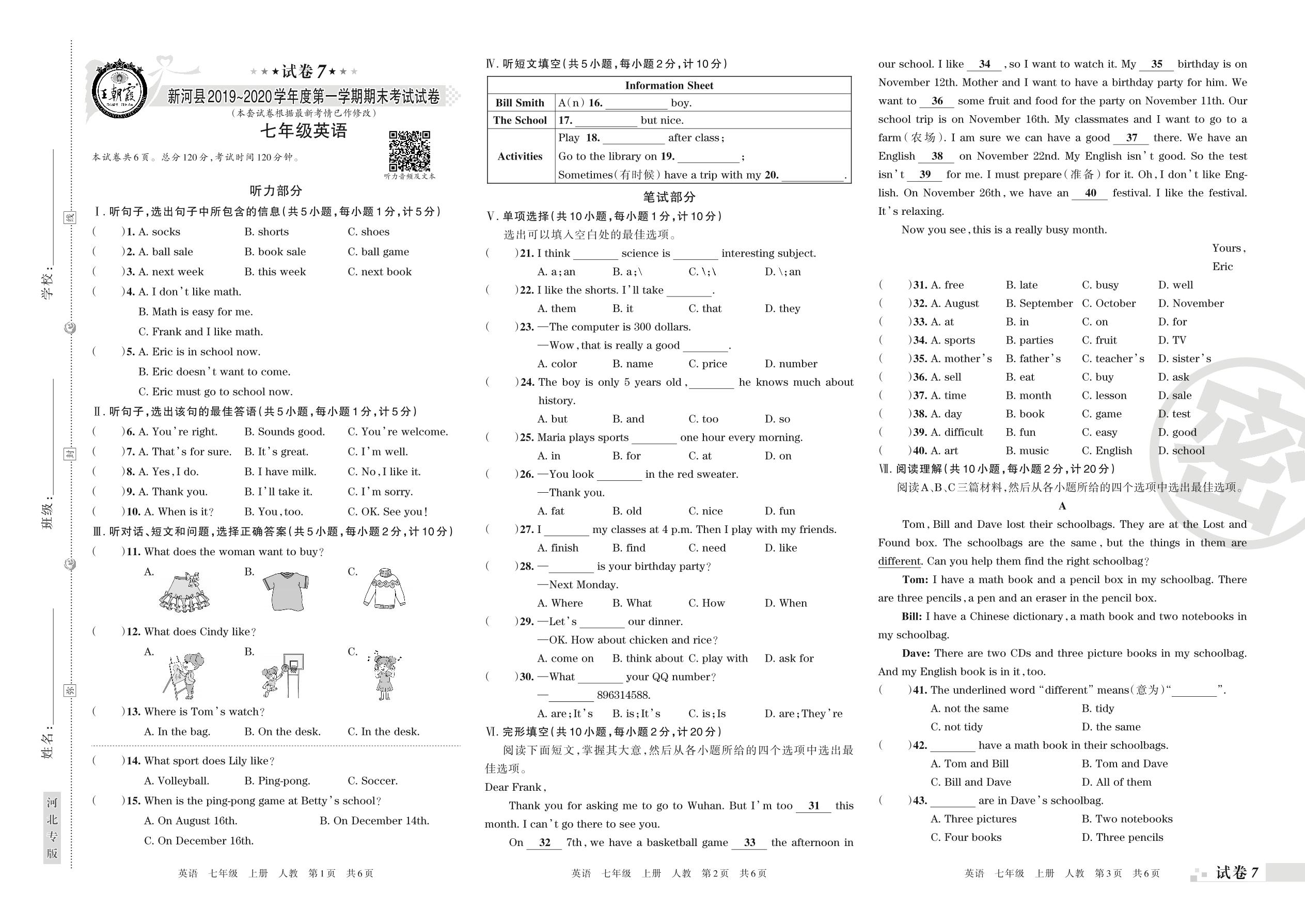七年级英语人教版上册期末卷